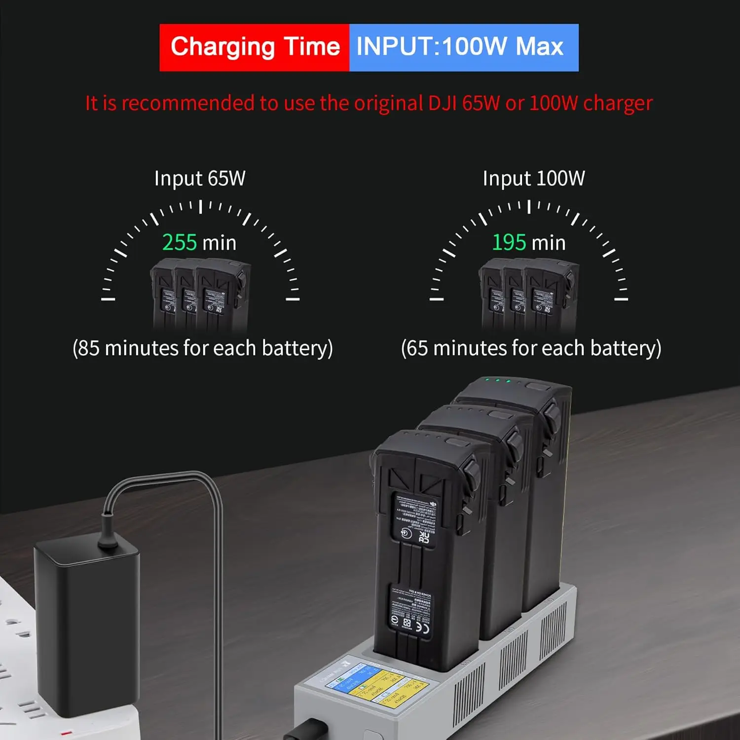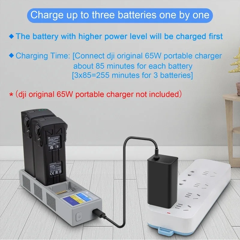 5.Conecte el cargador portátil original de 65 W] aproximadamente 85 minutos por batería 3 × 85=255 minutos para 3 baterías