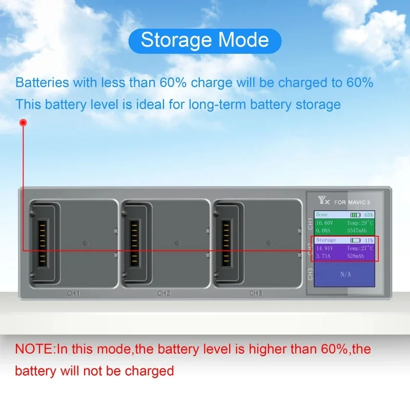 3.Modo de almacenamiento: en el modo de carga, mantenga presionado el botón durante 2 segundos para cambiar al modo de almacenamiento.La mejor energía eléctrica para el almacenamiento prolongado de drones es del 60%.En el modo de almacenamiento, la batería con una potencia inferior al 60% se puede cargar al 60% y luego detenerse automáticamente..Después del almacenamiento, se mostrará hecho (solo se puede almacenar y cargar la batería con una energía inferior al 60%, y la función de almacenamiento no se puede utilizar cuando la energía sea superior al 60%.