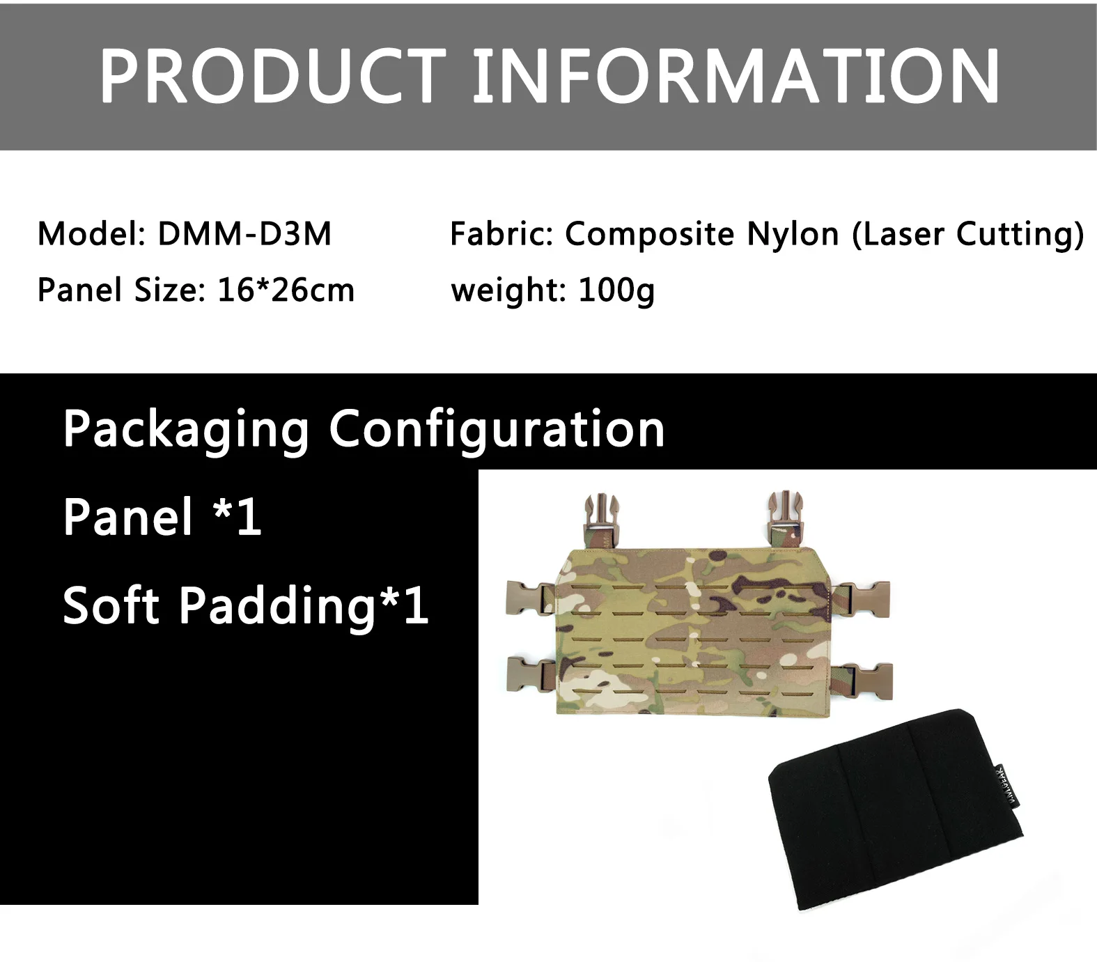Producto: Tablero de repuesto para colgar en el pecho SS / D3Tejido: Nylon compuesto (corte por láser)Peso: alrededor de 100 gColor: BK/RG/CB/MC/MCBK/WGFunción: sistema Molle/resistencia al desgaste/ligeroApto para: Tácticas / Tiro / Modelado / Entrenamiento / Airsoft / EleganteLista de embalaje: 1 * Panel, 1 * Almohadilla suave