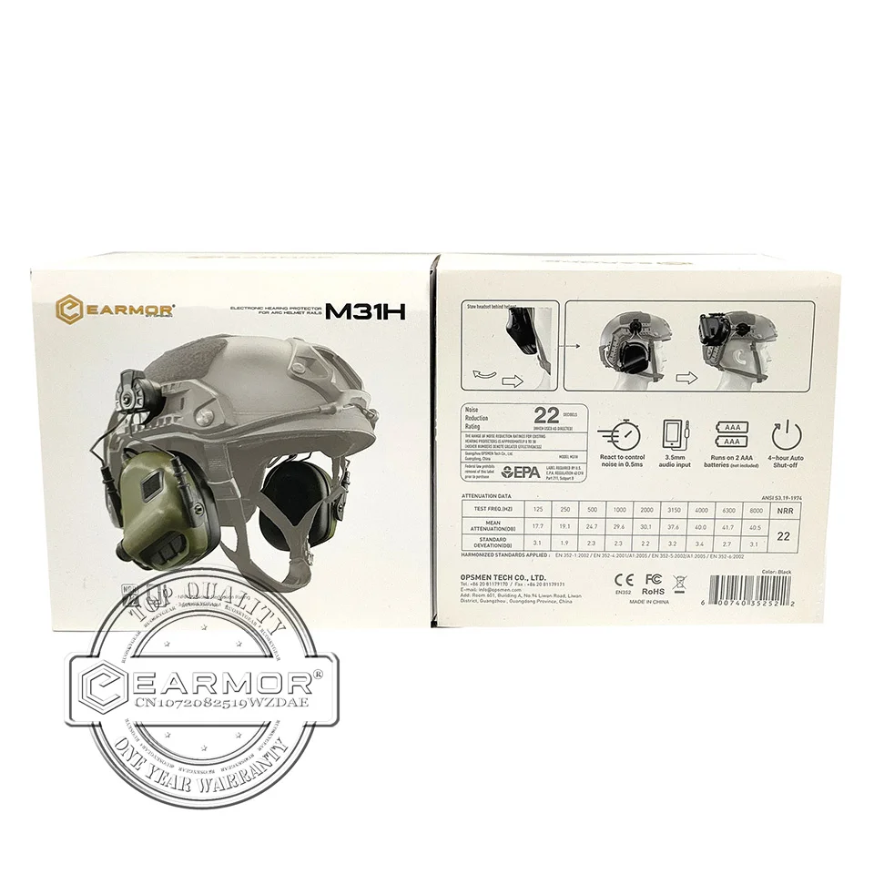 El EARMOR M31H MOD3 es un protector auditivo electrónico activado, basado en M31 MOD3 y viene con adaptador de riel de casco para acoplar al riel de casco Wendy EX. Puede eliminar el ruido dañino y amplificar los sonidos ambientales, le hace enfocar su atención en su caza y tiro, también garantiza que su audición pueda estar protegida cuando se dispara un arma.