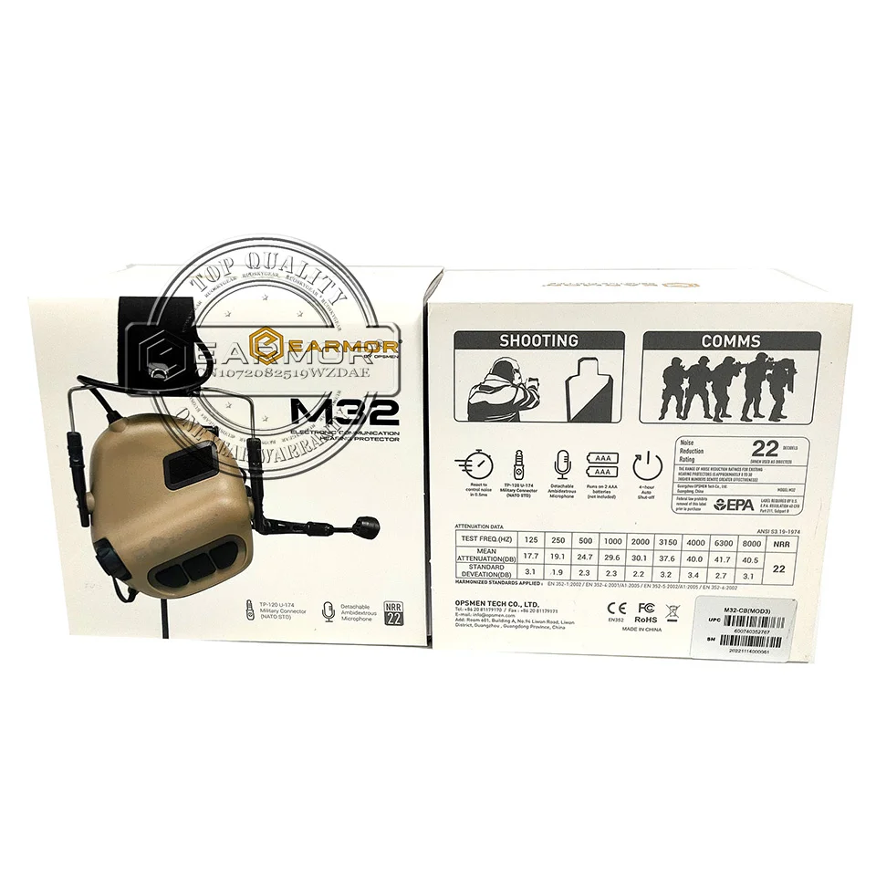 El M32 proporciona protección audible en áreas ruidosas con ruido impulsivo, como zonas de uso de armas de fuego. Los micrófonos montados en las orejeras mejoran el conocimiento de la situación del usuario, al tiempo que le permiten escuchar sonidos de los alrededores y proteger su audición. Los sonidos dañinos se limitan a un nivel seguro de 82 dB, y los más bajos se amplifican.