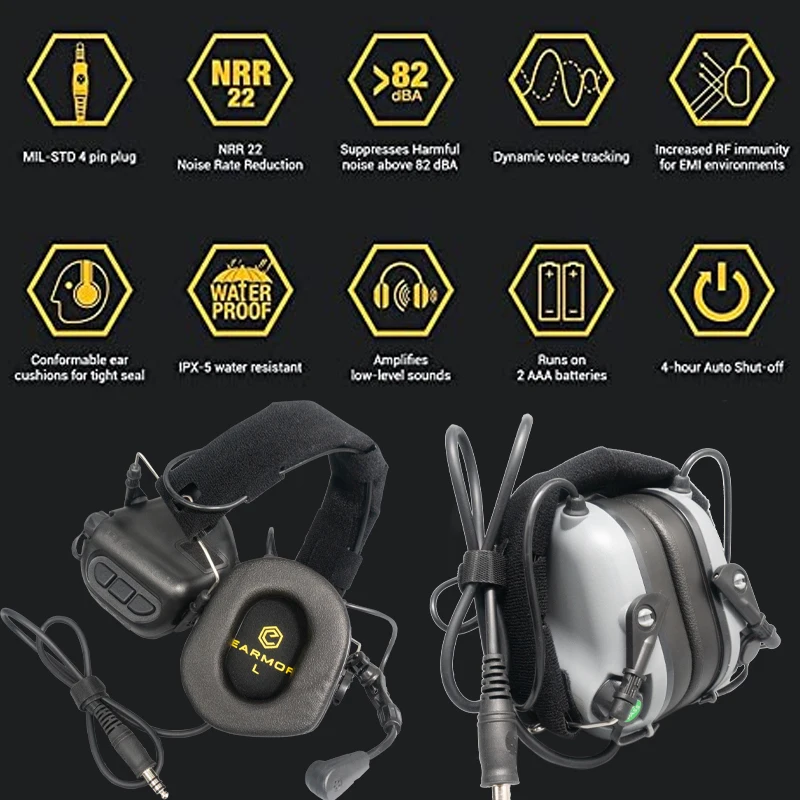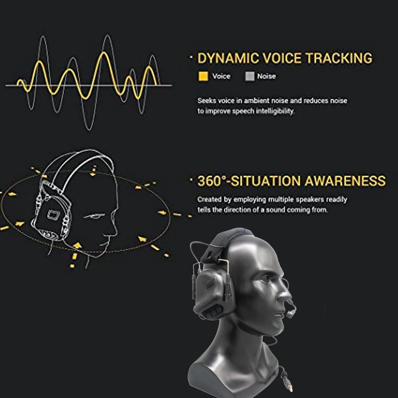 El M32 proporciona protección audible en áreas ruidosas con ruido impulsivo, como zonas de uso de armas de fuego. Los micrófonos montados en las orejeras mejoran la conciencia situacional del usuario, al tiempo que le permiten escuchar los sonidos de los alrededores y proteger su audición. Los sonidos dañinos se limitan a un nivel seguro de 82 dB, y los más bajos se amplifican.