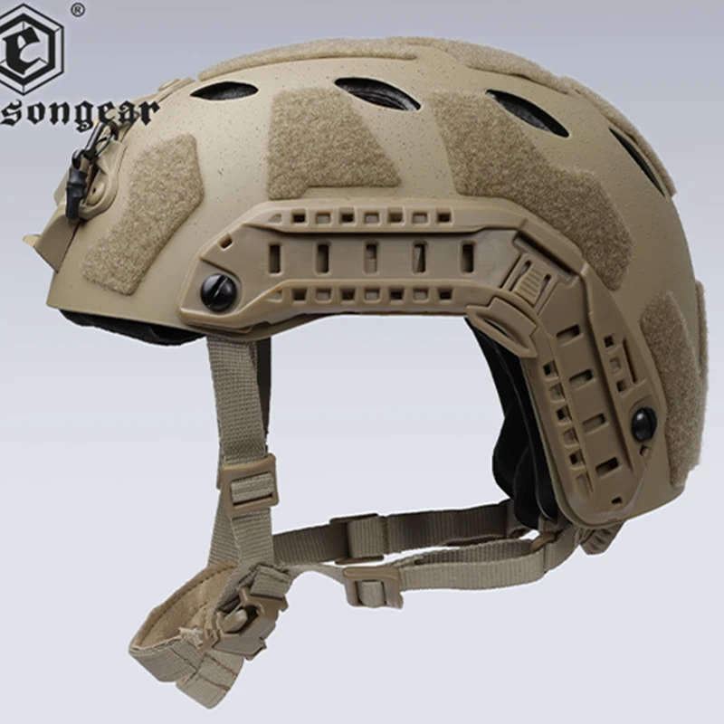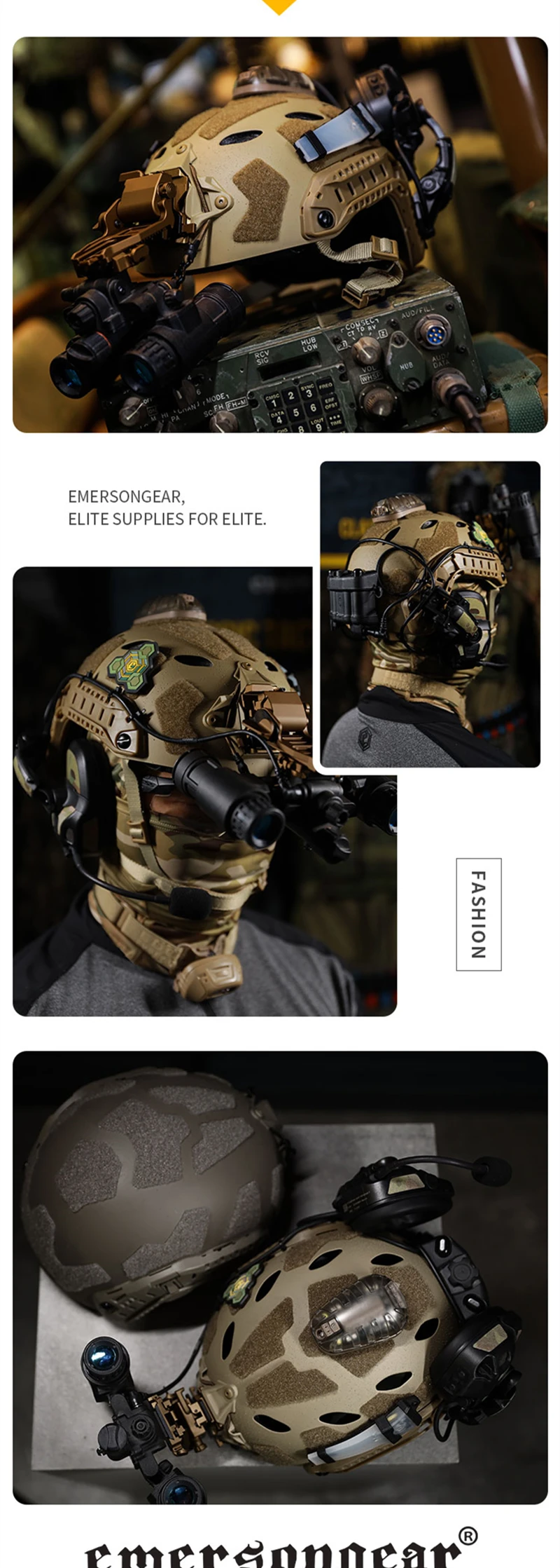 El casco táctico Emersognear Fast SF de corte ultraalto presenta un diseño de recorte ultraalto, con una ranura diseñada para acomodar los auriculares libremente. Los usuarios pueden ponerse y quitarse los cascos sin quitar los auriculares. También viene con soporte de visión nocturna de metal y adaptador NVG para adaptarse a gafas de visión nocturna como L4G24, etc. El casco también cuenta con diseños de ventilación para un mejor flujo de aire, mejorando la comodidad en condiciones de calor.