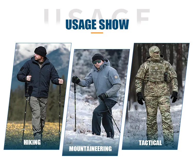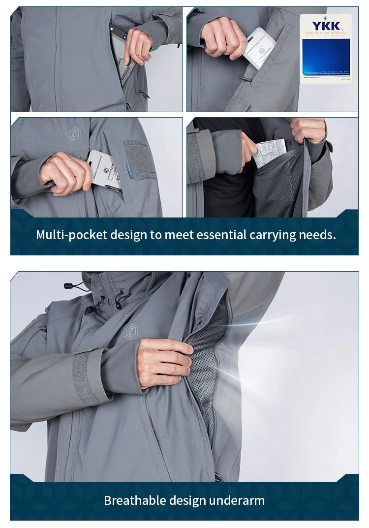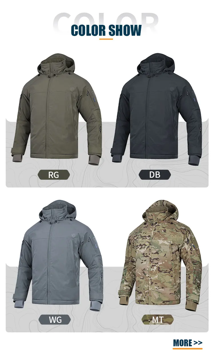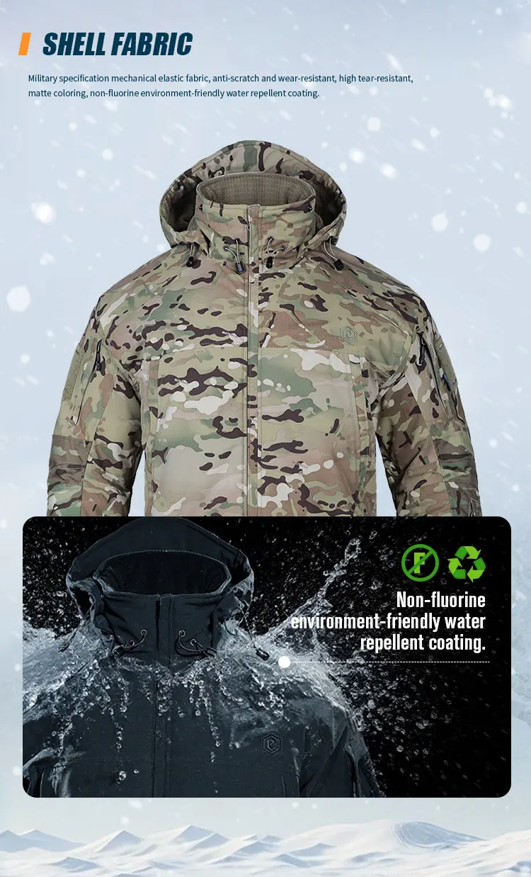 1Tela de concha: tejido elástico mecánico de especificación militar, antiarañazos y resistente al desgaste, muy resistente al desgarro, colorante mate, revestimiento repelente al agua respetuoso con el medio ambiente sin flúor.