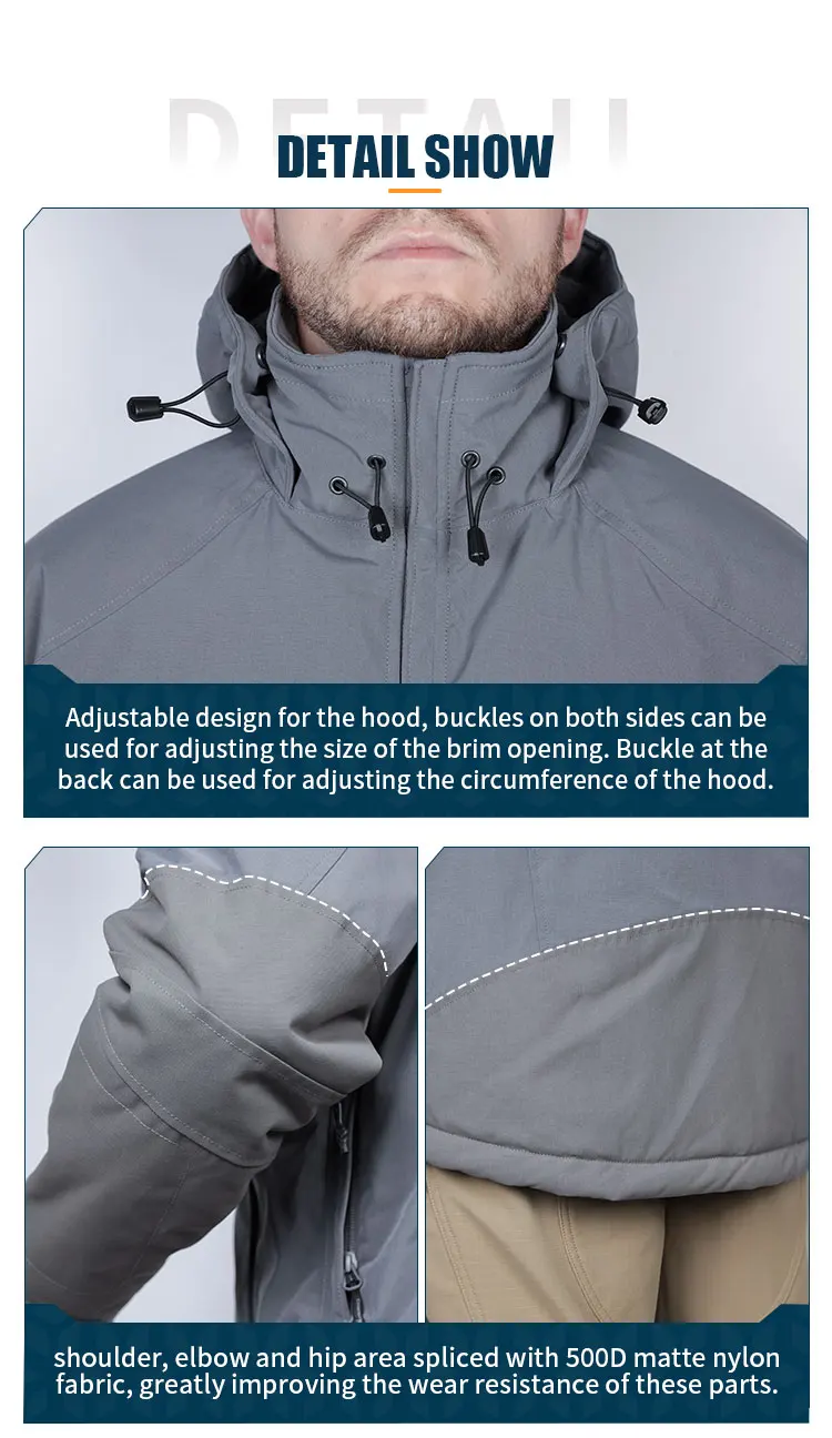 3Material de empalme de hombros y mangas: área de hombros, codos y cadera unida con tela de nailon mate 500D, lo que mejora en gran medida la resistencia al desgaste de estas partes.