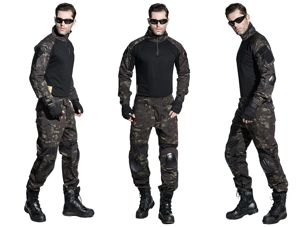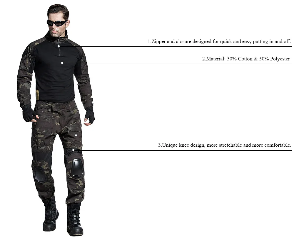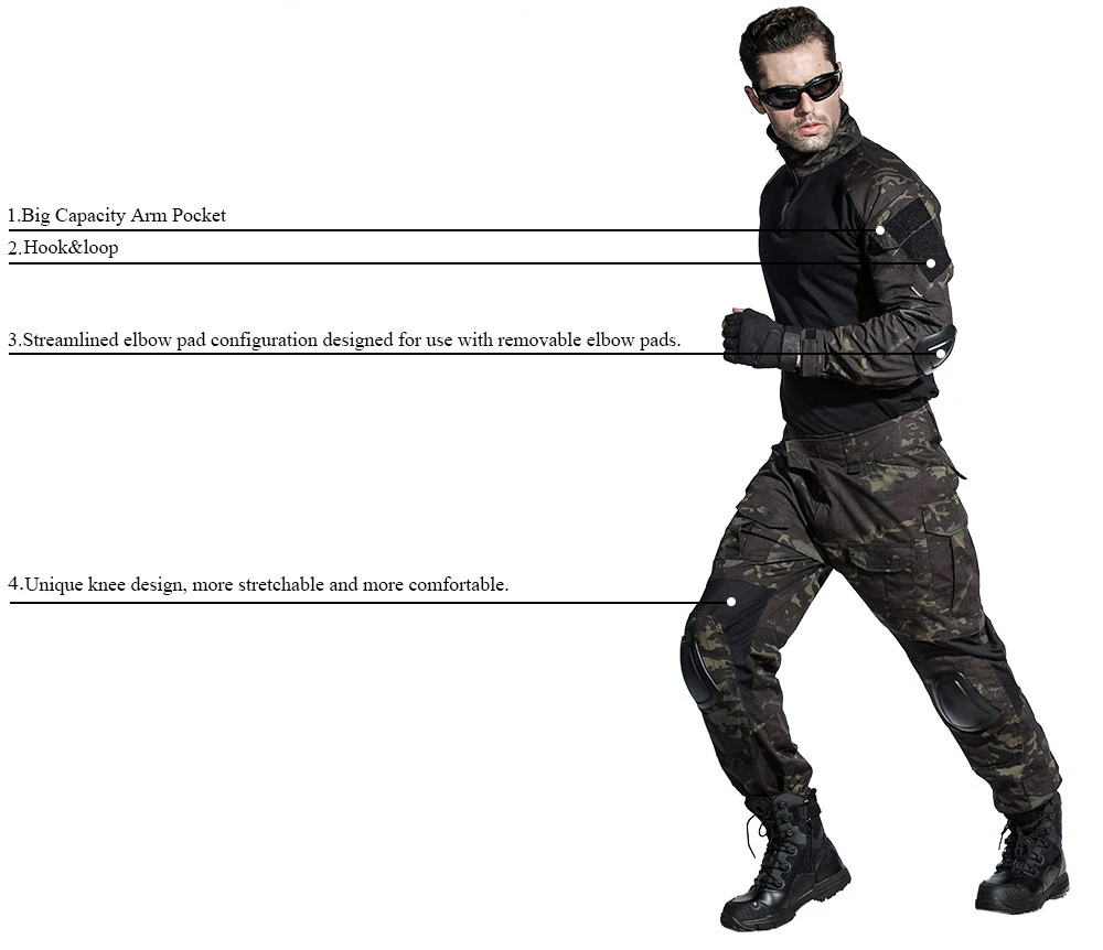 2)Package: a cambat shirt ,a pair of pants,a pair of knee pads,a pair of elbow pads