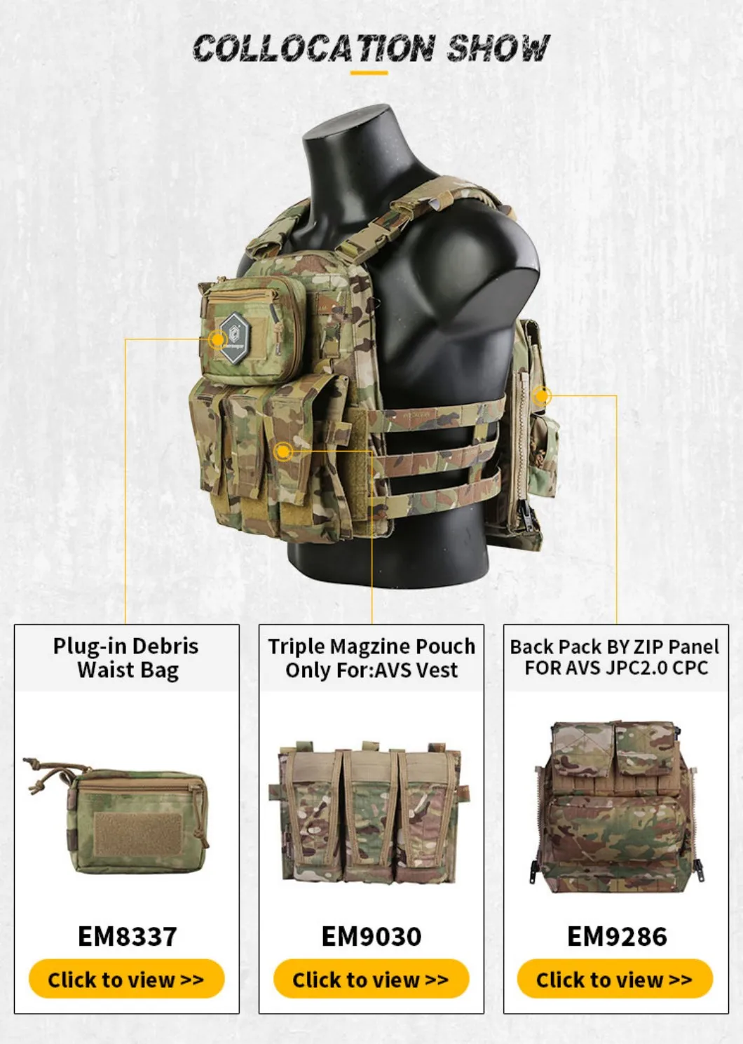 Emersongear Para CP STYLE El chaleco AVS liviano puede separar todas las piezas en accesorios independientes.El chaleco está equipado con marcos delanteros y traseros \ cinturones abdominales \ hombreras.El panel frontal MOLLE contiene una bolsa de triple cartucho con estructura "bolsa para mouse".Además, el interior de la parte posterior del chaleco está equipado con un cojín de esponja para garantizar la comodidad de carga y aumentar la circulación de aire de la espalda.El chaleco se puede montar de diferentes maneras para determinar si se requiere la función de liberación rápida.