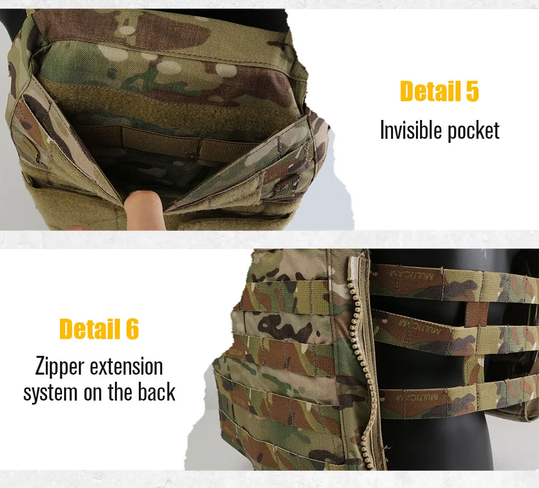 2.Tejido para regulaciones militares: el material principal del chaleco está hecho de nailon Cordura 500D con regulaciones militares, que es duradero, resistente a la abrasión y repelente al agua.