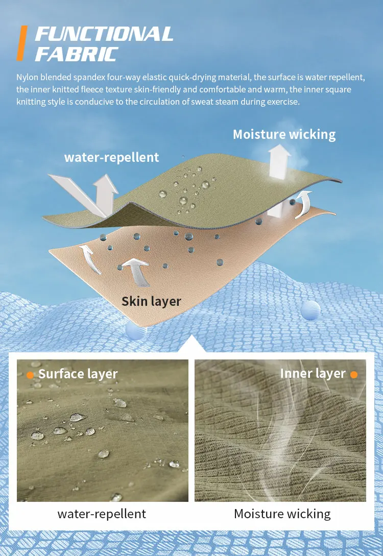 1. Material: nylon mezclado spandex de cuatro vías elástico de secado rápido, la superficie es repelente al agua, la textura interior de lana tejida agradable a la piel y cómoda y cálida, el estilo de tejido cuadrado interior es propicio para la circulación del vapor del sudor durante el ejercicio.