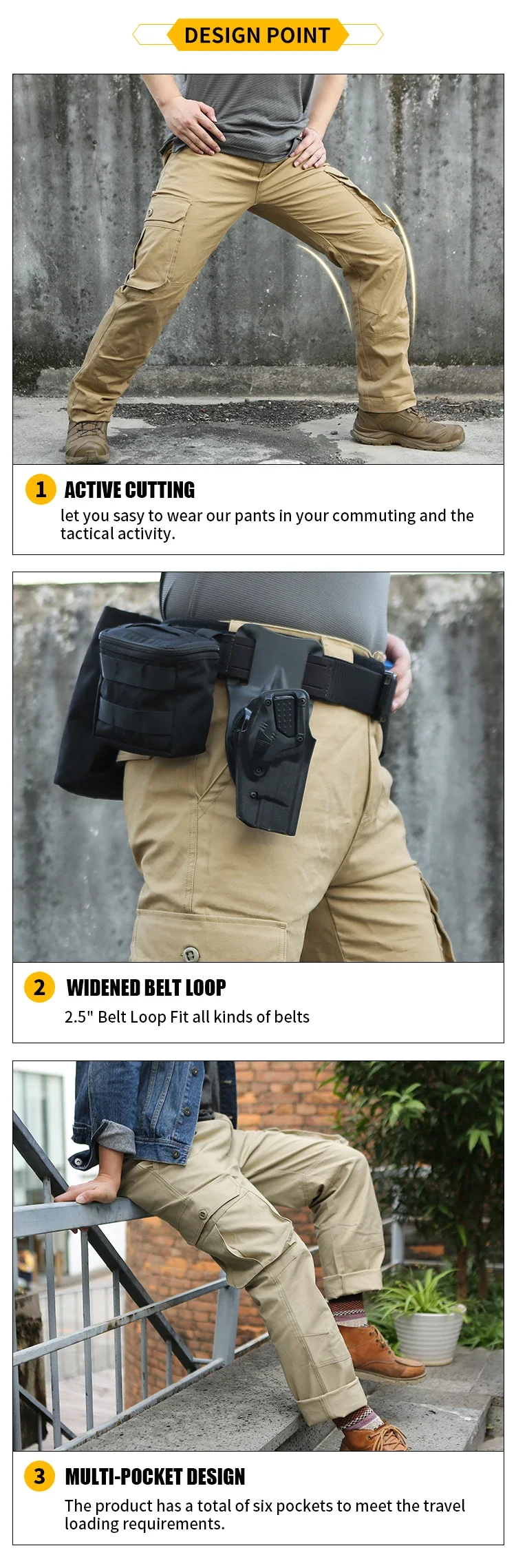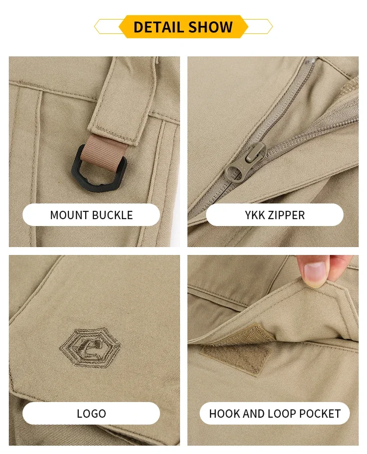 6 bolsillos: 2 bolsillos delanteros estándar, 2 bolsillos de carga traseros, 2 bolsillos de carga en el muslo