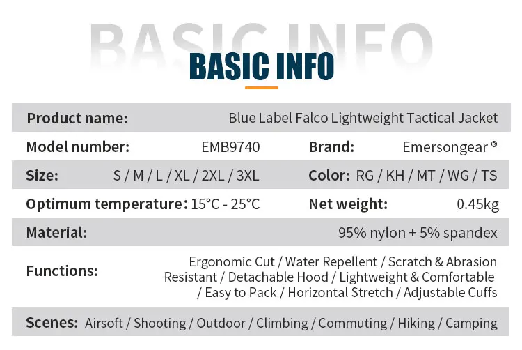 Emersongear BlueLabel Falco chaqueta táctica ligera abrigo de corte ergonómico ligero Camping al aire libre viajes urbanos EMB9740
