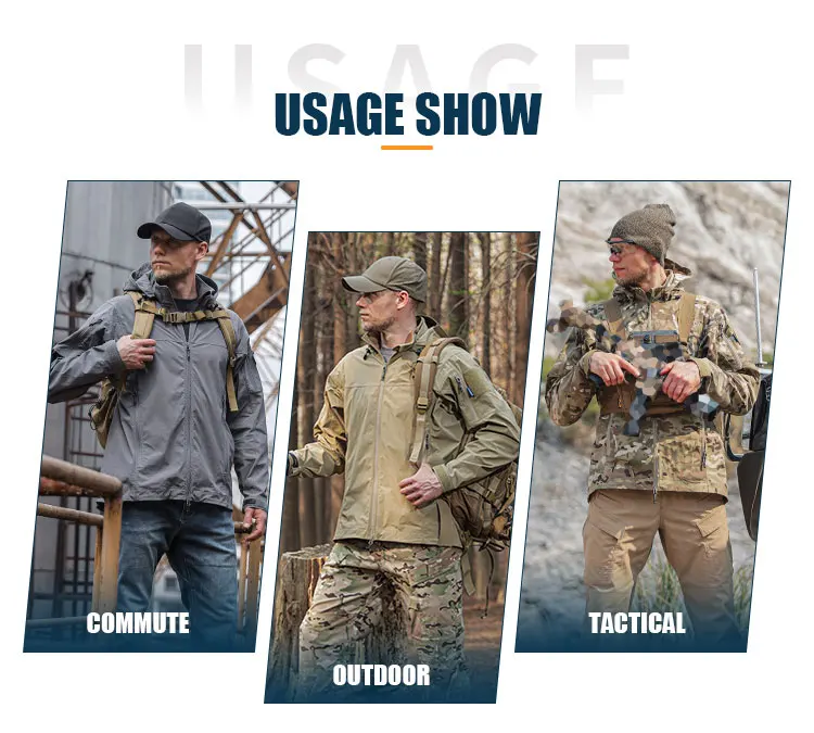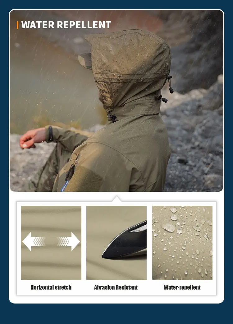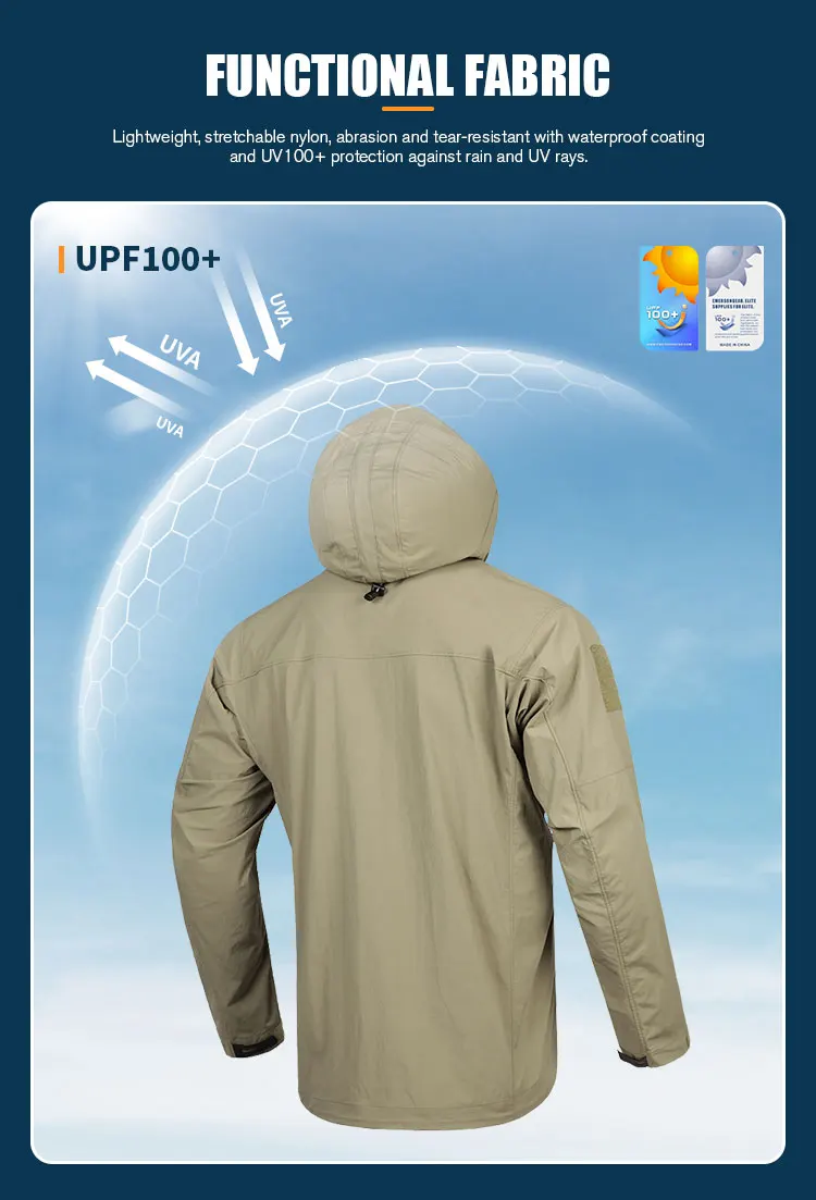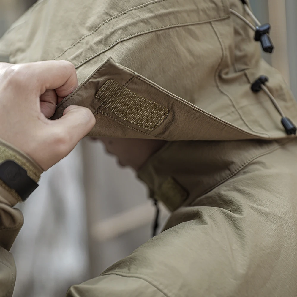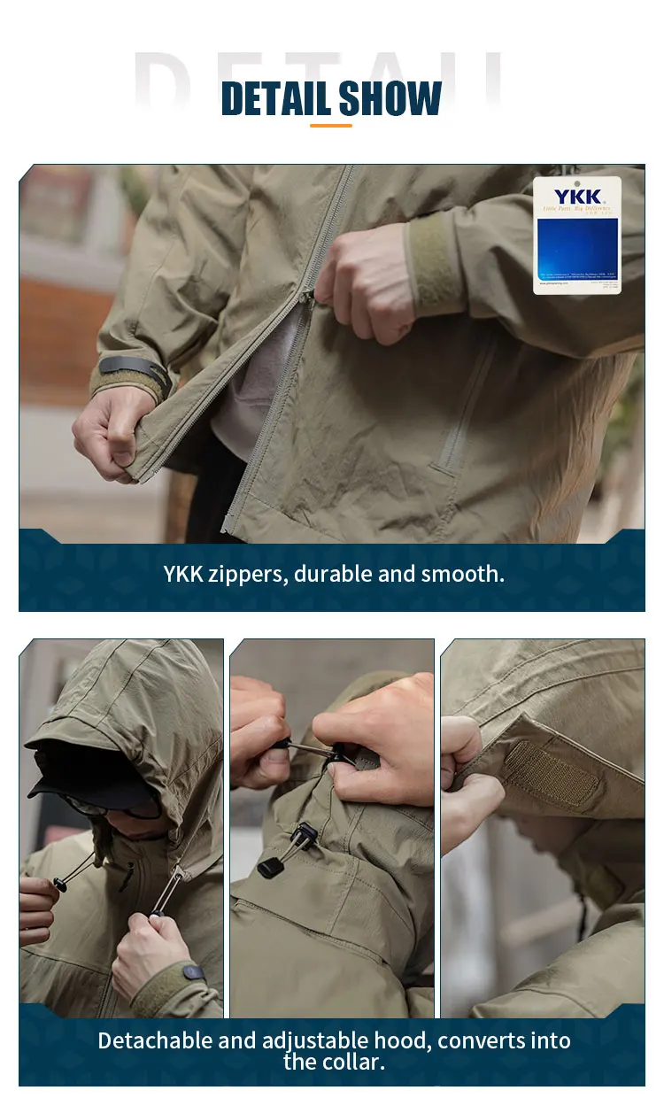 Función: Corte ergonómico / Repelente al agua / Resistente a rayones y abrasión / Capucha desmontable / Ligero y cómodo / Fácil de empacar / Estiramiento horizontal / Puños ajustables