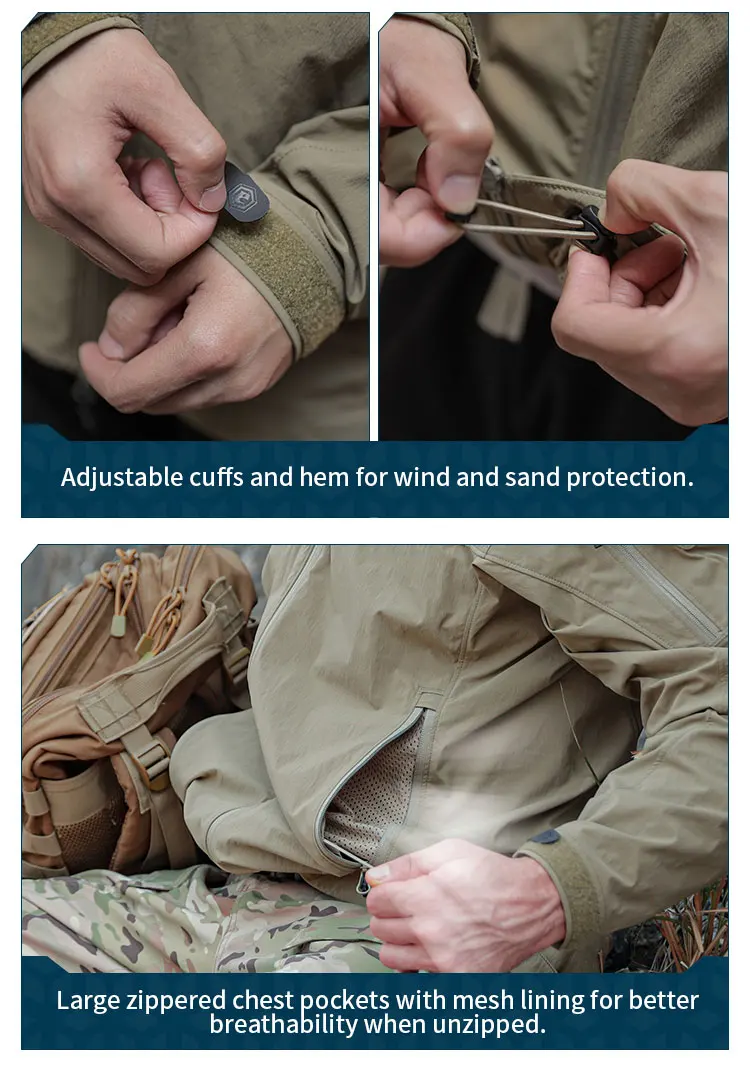 Ajustabilidad: Puños y dobladillo ajustables para protección contra el viento y la arena.