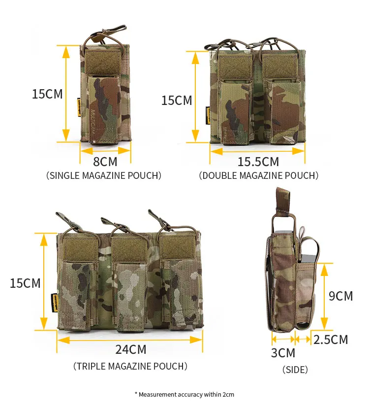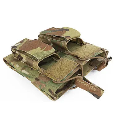 Este producto tiene capacidad para 3 cargadores de 5.56 y 3 cargadores estándar.La bolsa para cargador de 5.56 se fija mediante una cuerda elástica, y el cargador cargado se puede tirar fácilmente con una mano para sacarlo sin que se caiga.El bolsillo para cargador superior se fija con un velcro desmontable. Dependiendo del cargador que se utilice, la cubierta del bolsillo mágico se puede usar o no.El sistema MOLLE en la parte trasera facilita el transporte de esta bolsa para cargadores en equipos como chalecos o mochilas con sistema MOLLE, permitiendo una carga y descarga sencilla y rápida.