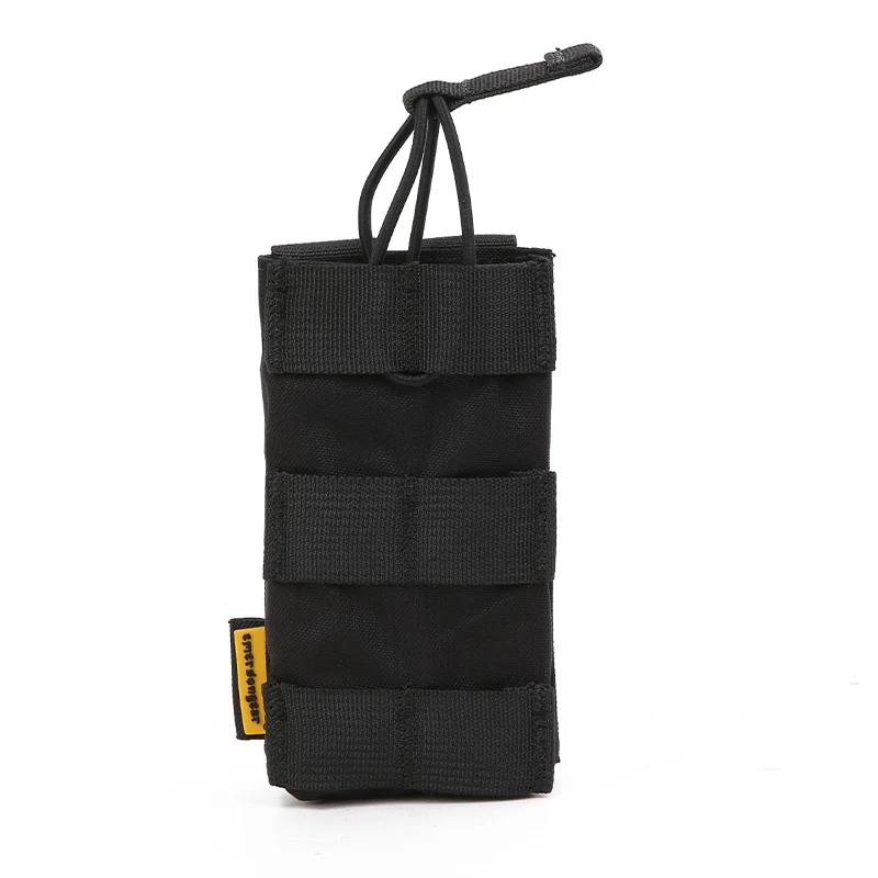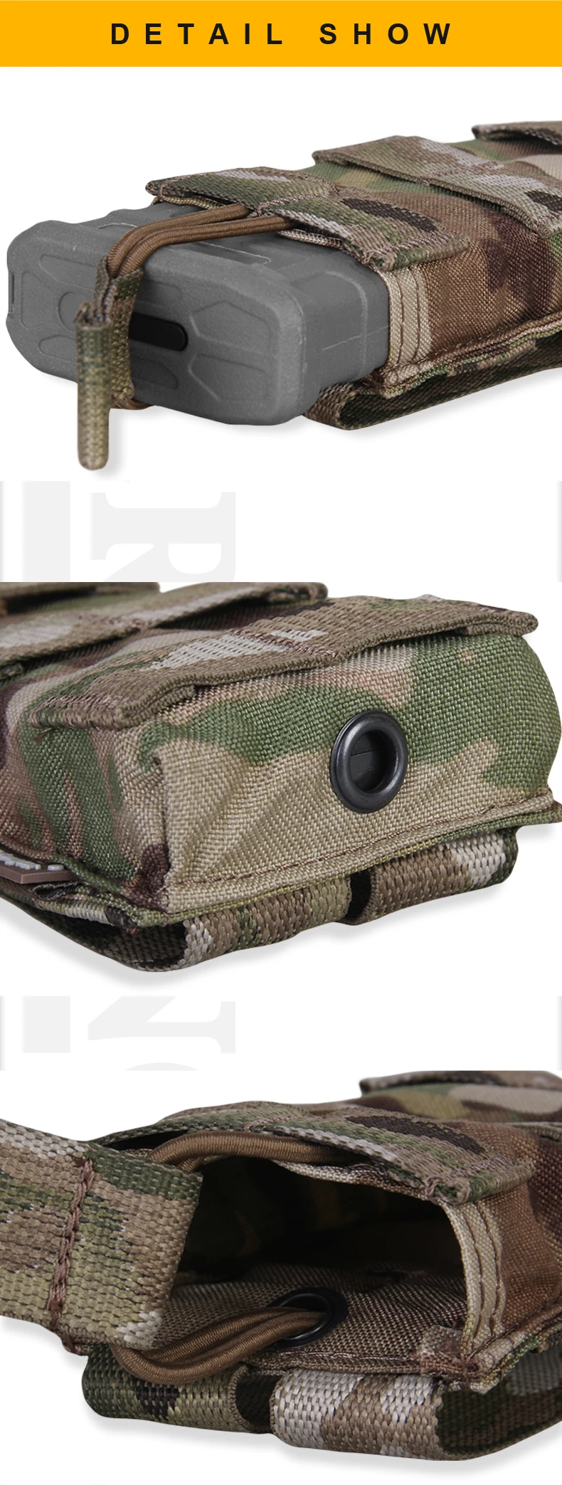 The product can hold 1 magazine, and the main material is made of military-standard 500d wear-resistant material, which has the function of water-repellent. Compared with the conventional magazine bag, the flip cover of the magazine bag has been cancelled as a whole, and the closure and anti-drop functions are also completed by the elastic band. This makes this magazine bag have an excellent self-weight advantage, and it is easy to operate with one hand in actual use.