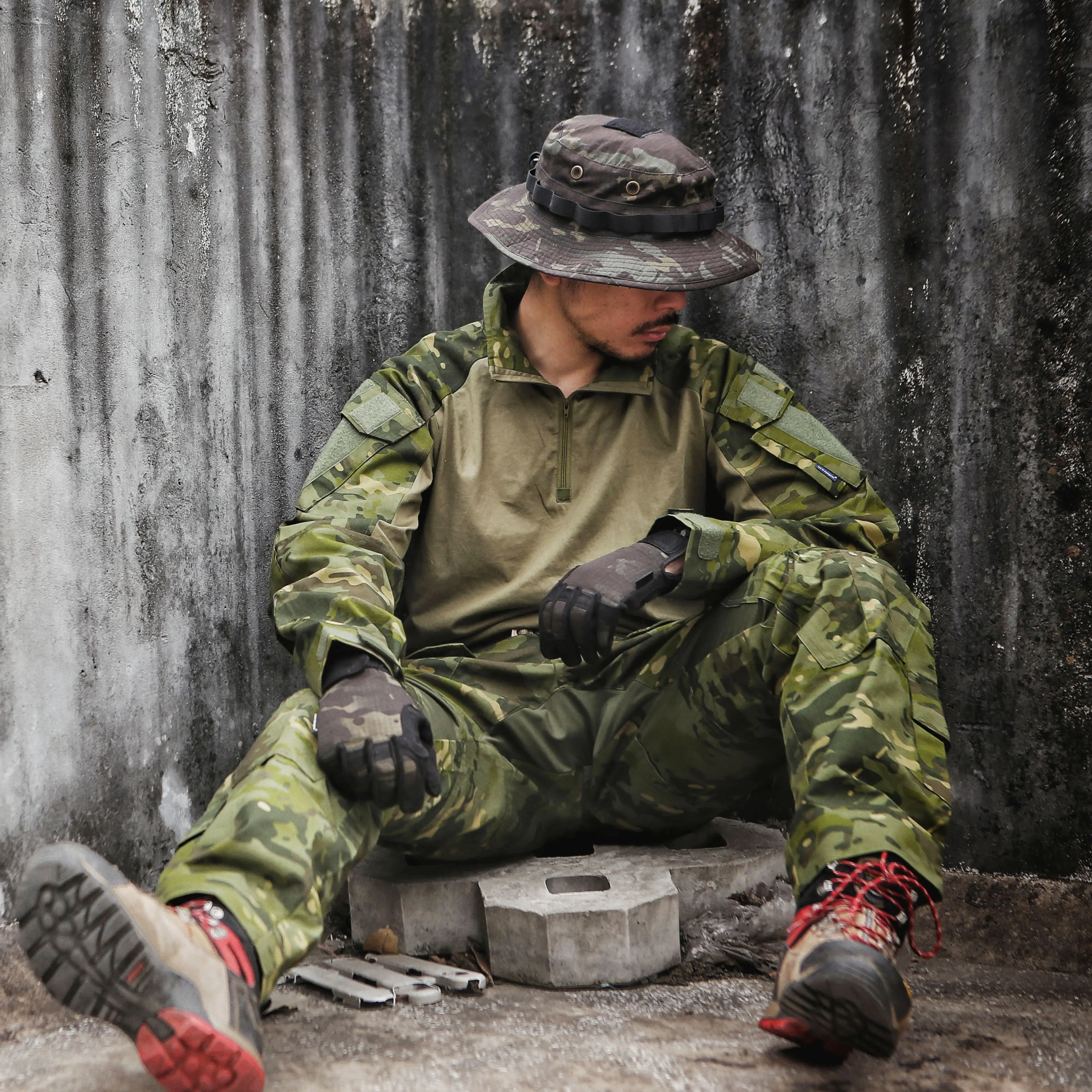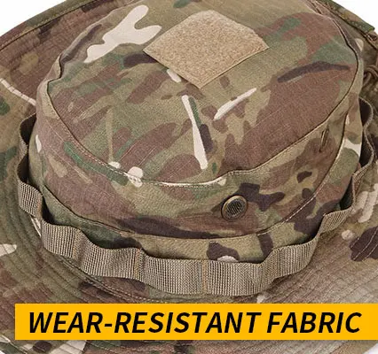 Sobre la base del "sombrero Benny" básico, el sombrero agrega la función de ajuste de la circunferencia de la cabeza, lo que elimina por completo el problema del recuento del jardín.Hay un círculo completo de correas MOLLE en el automóvil fuera del sombrero para facilitar la fijación de la vegetación y otros desechos para lograr el efecto de camuflaje.Benny hat puede ejercer minuciosamente sus ventajas a través de las funciones de mejora anteriores y cubrir al máximo la forma de la cabeza humana en la jungla, en un ambiente húmedo de cría de mosquitos. El ala del sombrero se puede ajustar para que esté cerca de la cara. para proteger órganos importantes como oídos y ojos.