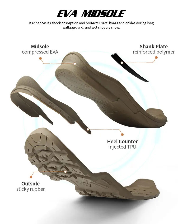 2Suela: La suela de goma de alta densidad proporciona una fuerte tracción, antideslizante y protección contra pinchazos.Con la entresuela de EVA, mejora su absorción de impactos y protege las rodillas y los tobillos de los usuarios durante largas caminatas.