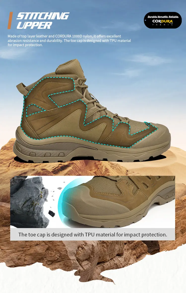 1Parte superior: Fabricada con capa superior de cuero y nailon CORDURA 1000D, ofrece una excelente resistencia a la abrasión y durabilidad.La puntera está diseñada con material TPU para protección contra impactos.