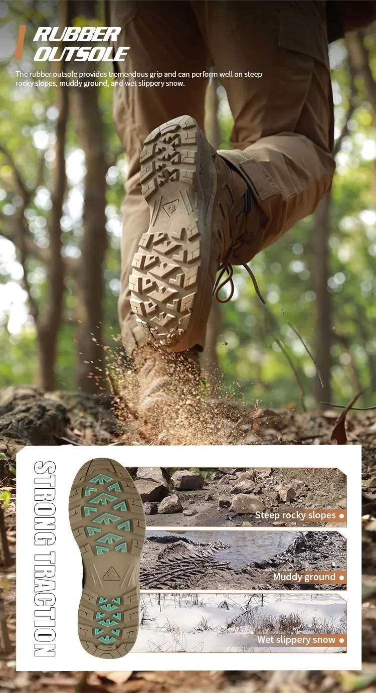 5. La suela de goma proporciona un tremenda agarre y puede funcionar bien en pendientes rocosos empinados, terrenos embarrados y nieve húmeda y resbaladiza.La entresuela de EVA que absorbe los golpes reduce eficazmente la presión sobre el tobillo y la rodilla durante largas caminatas.