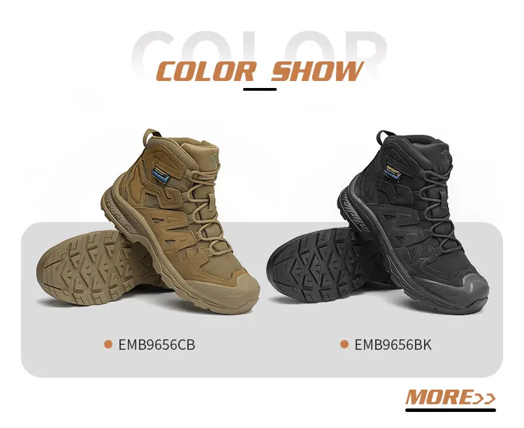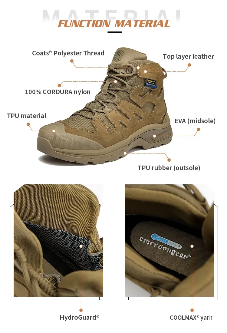 6.La membrana impermeable interna HydroGuard tiene un rendimiento impermeable extremadamente alto para hacer frente al ambiente húmedo mientras mantiene una buena transpirabilidad.La plantilla CoolMax mantiene a los usuarios secos y sin congestión durante largas caminatas.