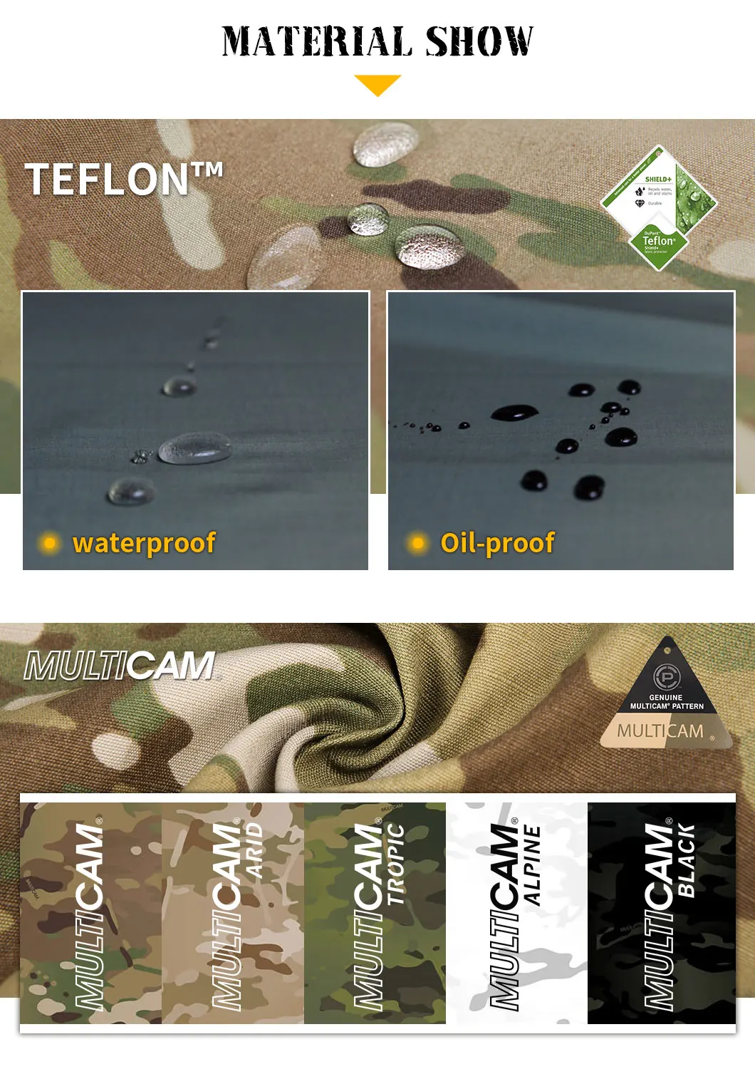 Material: fabricado por ORIGINAL MULTICAM® NYCO, RIPSTOP (Nylon) de 6,6 OZ con 50% algodón y 50% nailon, la sensación es portátil, cómoda y duradera.