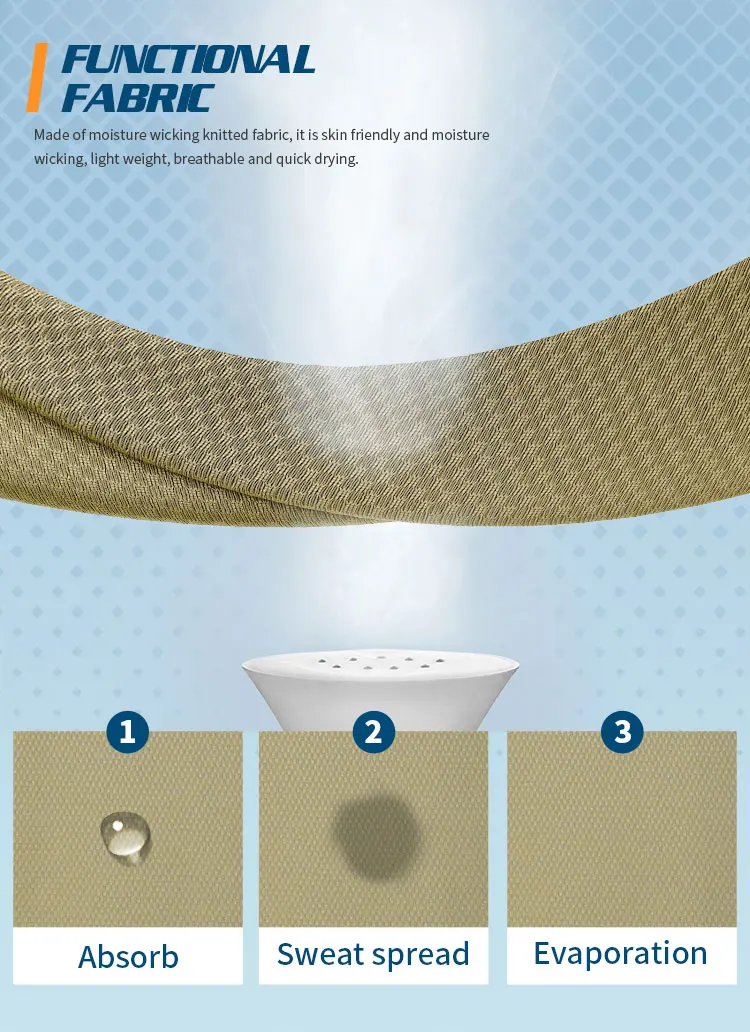 1.Functional Fabric: Made of moisture wicking knitted fabric, it is skin friendly and moisture wicking, light weight, breathable and quick drying.