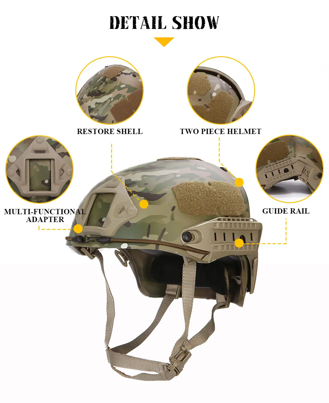 4.Modular: el producto tiene un sistema modular, que puede agregar otros equipos como equipos de cámara/auriculares a través de los rieles guía tácticos en ambos lados del casco.