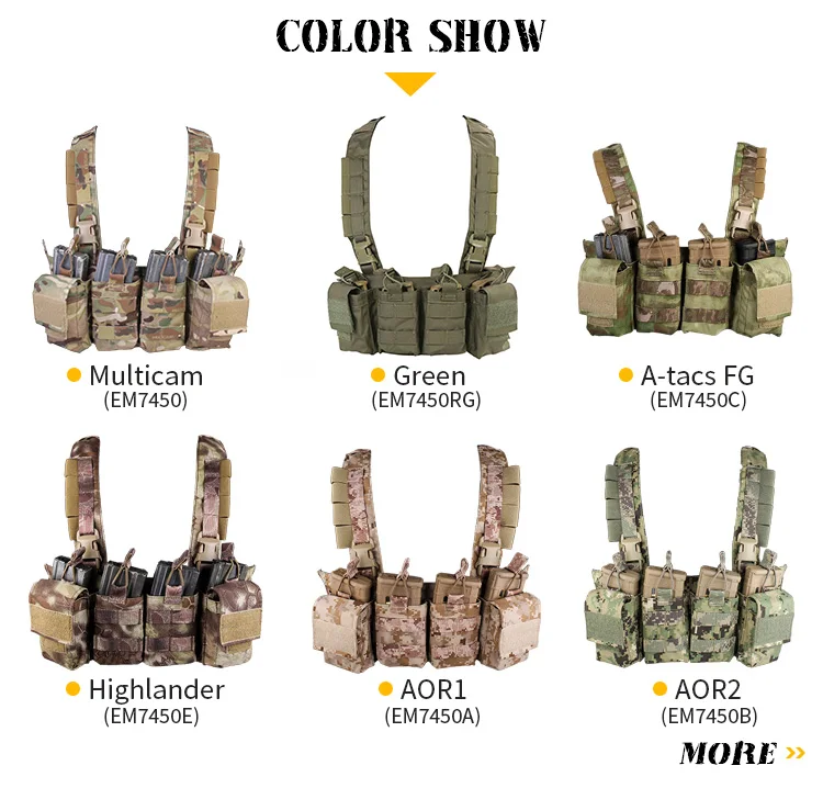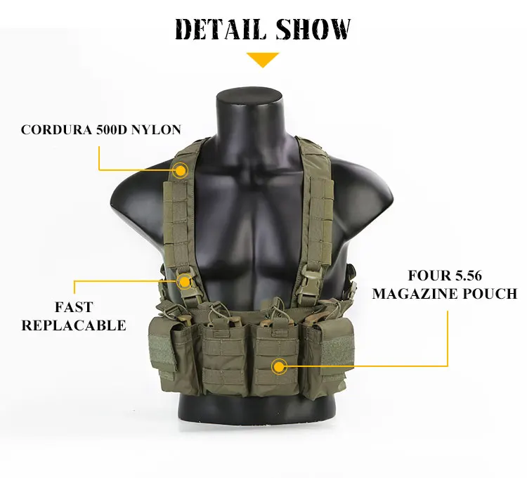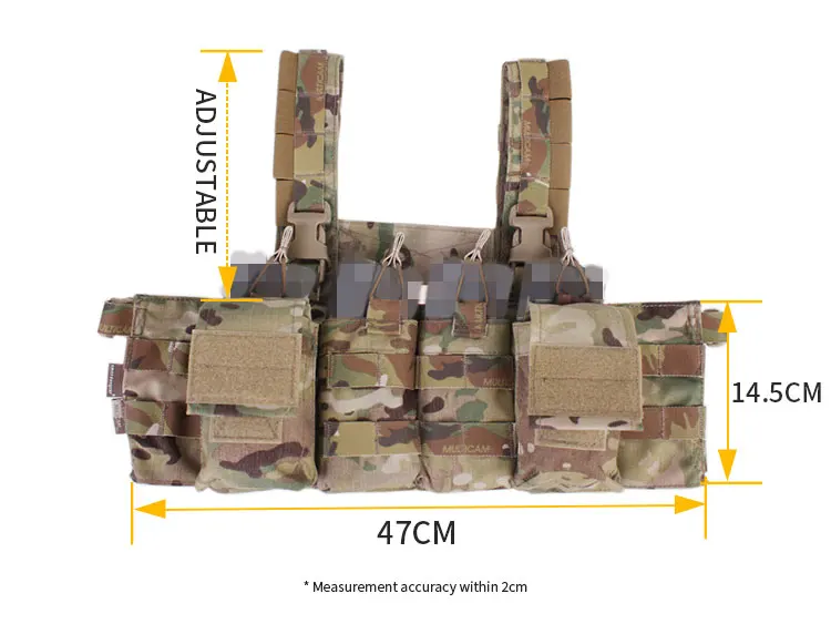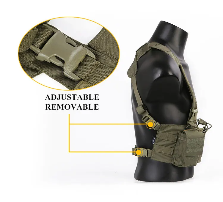 The total weight of this Chest Rig is 0.436kg, with a high degree of lightweight, easy to wear and convenient for the wearer to move; It has strong storage property, and can carry different equipment according to the actual situation. It is not bulky, easy to take and carry, and the supplementary bulletproof vest mounting function can also be disassembled separately, which can be directly used as the accessory bag of the bulletproof vest; Multi color options, can be matched with different colors, camouflage equipment, for different activities.