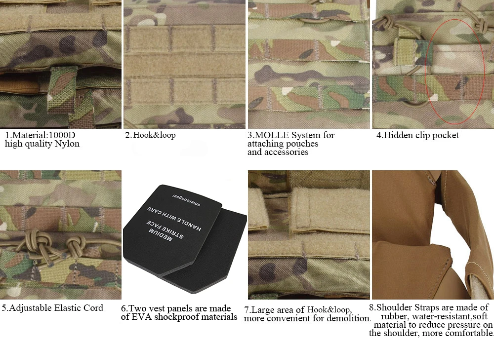 EMERSONGEAR JPC vest equipped with the two plate carriers which is the new version made by EVA shockproof materials, more lighter and more comfortable, if you need plastic ballistic plates and need to be purchased separately or please contact us first.