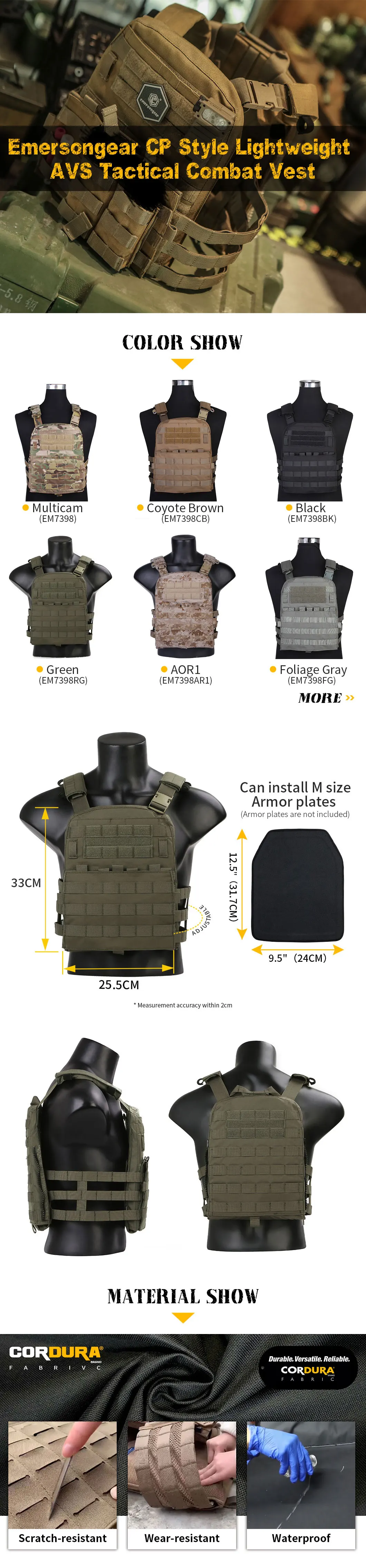 Emersongear para chaleco táctico estilo AVS, portador de placa ligero MOLLE Airsoft, equipo de protección de combate deportivo para caza al aire libre