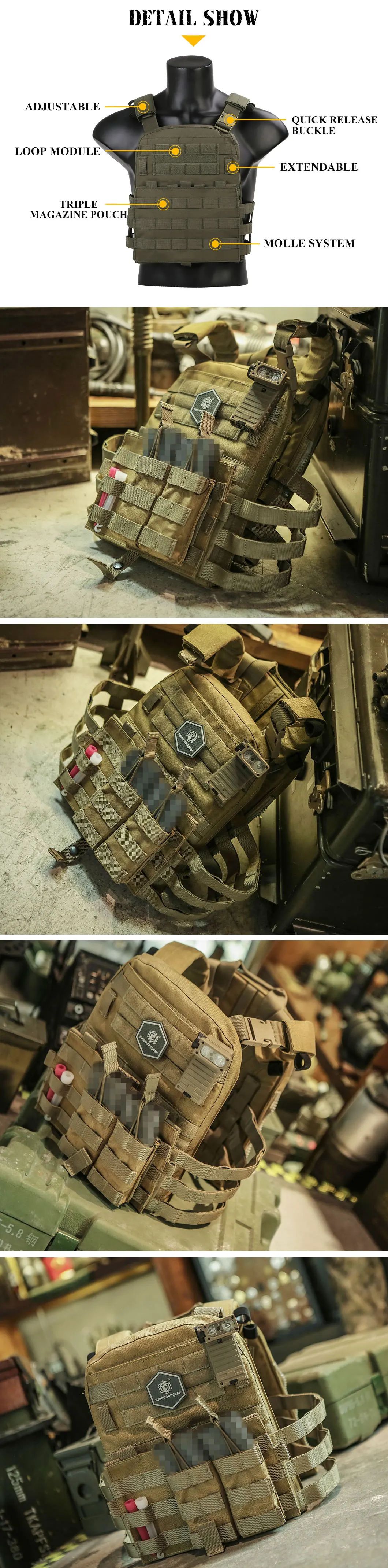 El paquete incluye: 1 chaleco transportador AVS ligero de liberación rápida Emersongear