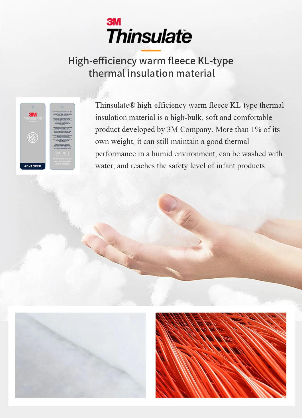 2Material de relleno del cuerpo: Thinsulate® El material de aislamiento térmico tipo KL de lana cálida de alta eficiencia es un producto de gran volumen, suave y cómodo desarrollado por 3M Company.No supera el 1% de su propio peso y aún puede mantener un buen rendimiento térmico en ambientes húmedos.Se puede lavar con agua y alcanza el nivel de seguridad de los productos infantiles.