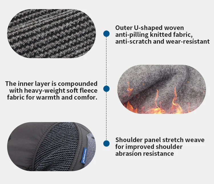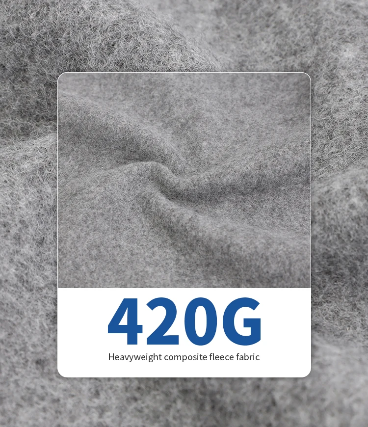 1. Functional fabric: 420g heavyweight composite fleece fabric, outer layer U-shaped woven anti-pilling knitted fabric, scratch-resistant and wear-resistant to provide outer layer protection, inner layer composite heavyweight soft fleece fabric, warm and comfortable. "