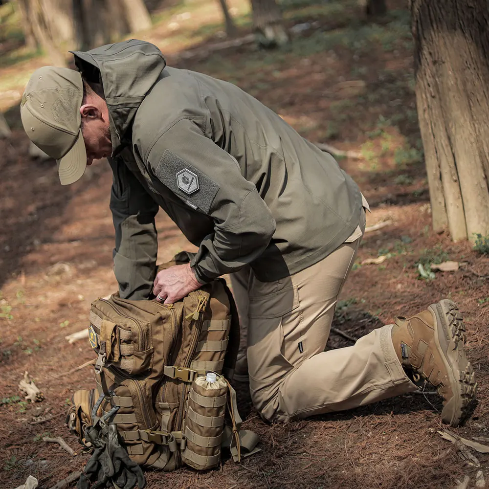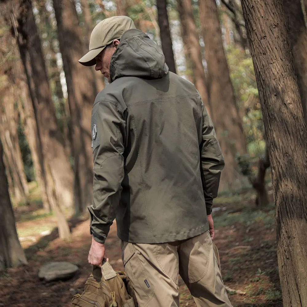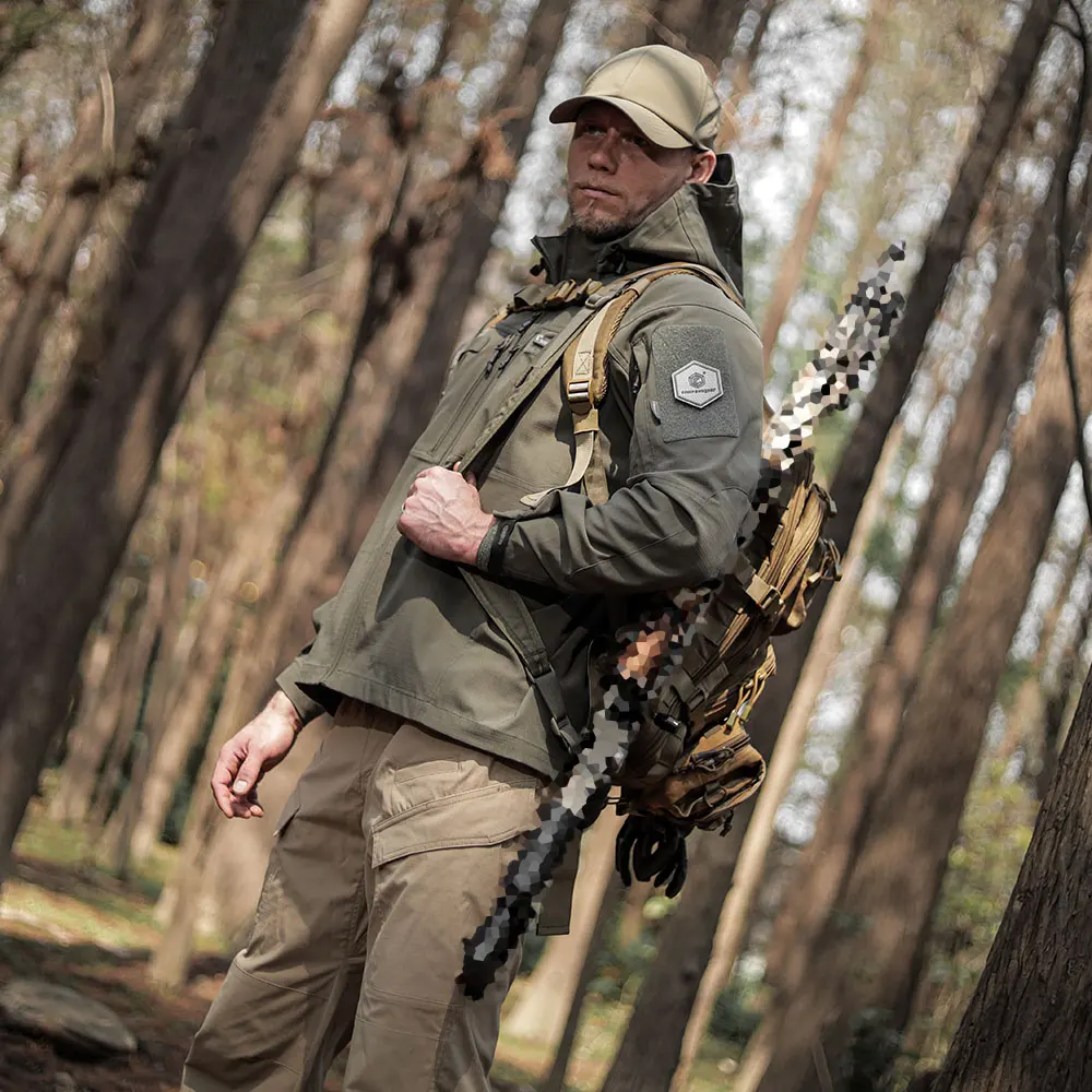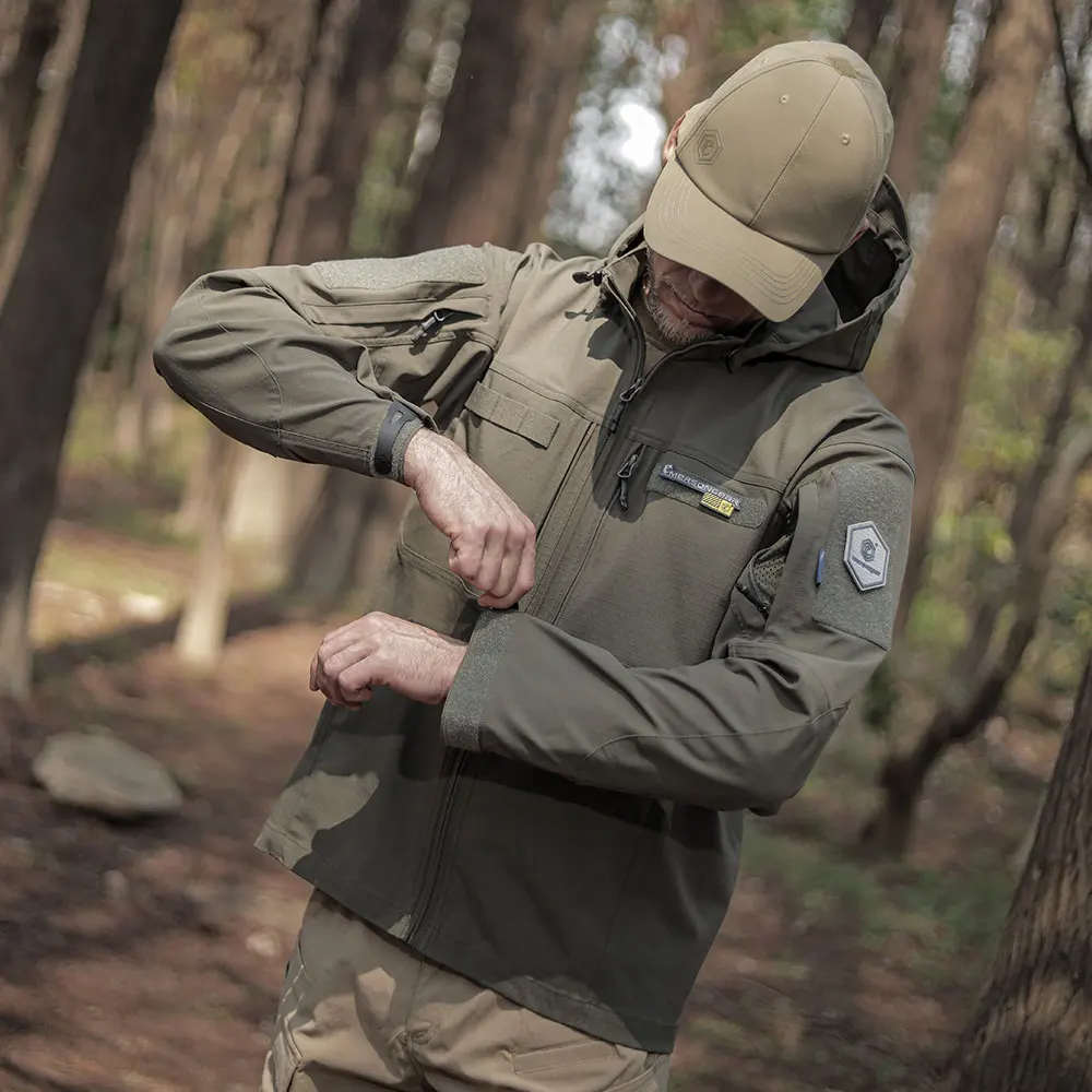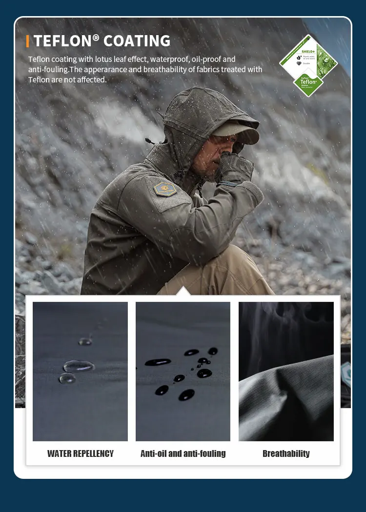 Función: Corte ergonómico / Recubrimiento de teflón / Resistente a rayones y abrasión / Estiramiento horizontal / Capucha desmontable / Puños ajustables / Diseño Molle en el pecho delantero