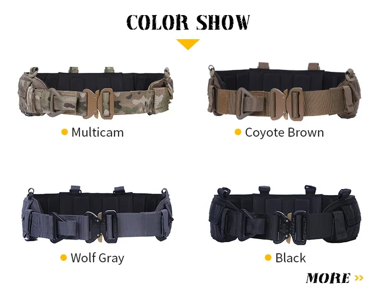 Emersongear Cobrabuckle Battle Belt adopts the internal and external waistband mode, which is equipped with a 1.75 internal waistband and an external waist seal body. Such a design determines the possibility of quick disassembly and quick response. Players can use this product in combination and separately. The outside of the waist seal body is made of block unit structure, which makes the tactical accessories fit the body after being installed. In addition, there is a cushion to improve the comfort of the waist after fastening. In addition, the end MOLLE block element is designed to be fully open and closed. It can be used as auxiliary fixation with leg rifle cover and leg plate.