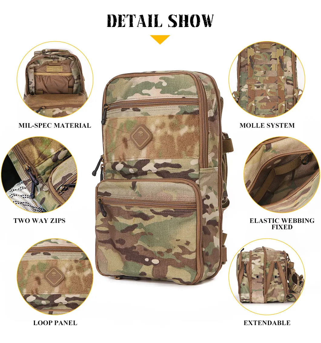 La bolsa multiusos Emersongear D3 está hecha de nailon Cordura 500D con regulaciones militares, que es duradero, resistente a la abrasión y repelente al agua.La bolsa se puede usar como una mochila pequeña de forma independiente o se puede combinar con una correa para el pecho D3CR especial para reemplazar la correa para el pecho original como una mochila con bolsa de agua, de modo que el D3CR se pueda guardar completamente cuando se almacena.La parte más ingeniosa del diseño de la bolsa es que las cremalleras de expansión están colocadas en cada compartimento del paquete, lo cual es muy práctico cuando el espacio es urgente.