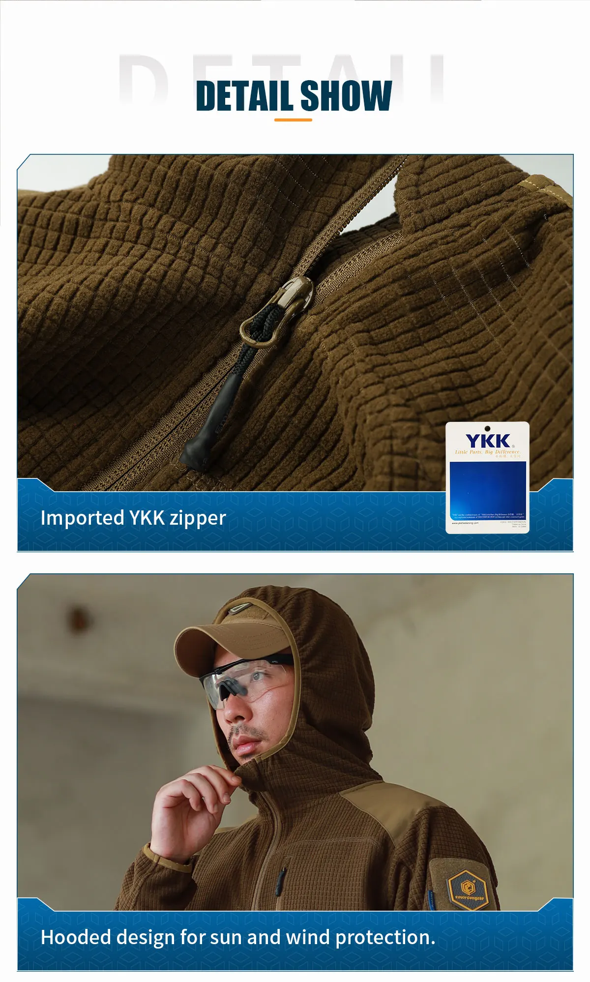 Función: Corte ergonómico / Calidez y transpirabilidad / Refuerzo de cerradura / Diseño con capucha
