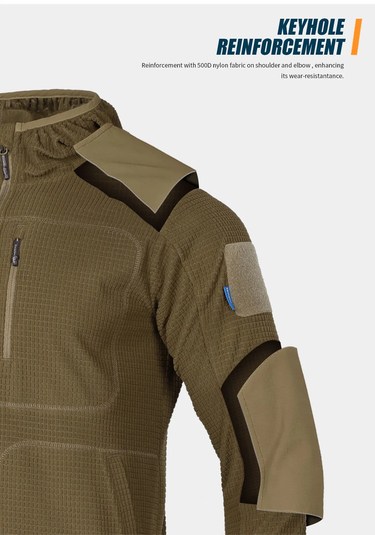 2.Refuerzo con tejido de poliéster 500D en hombros y codos, mejorando su resistencia al desgaste.