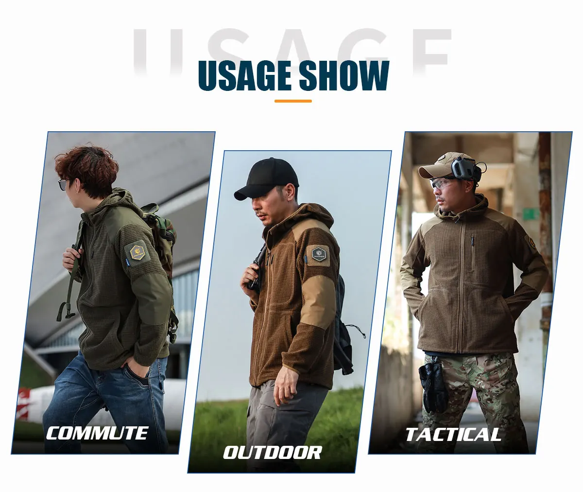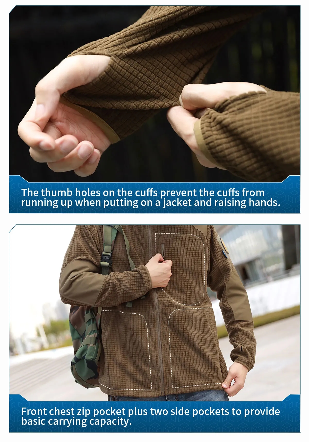 2.Refuerzo con tejido de poliéster 500D en hombros y codos, mejorando su resistencia al desgaste.