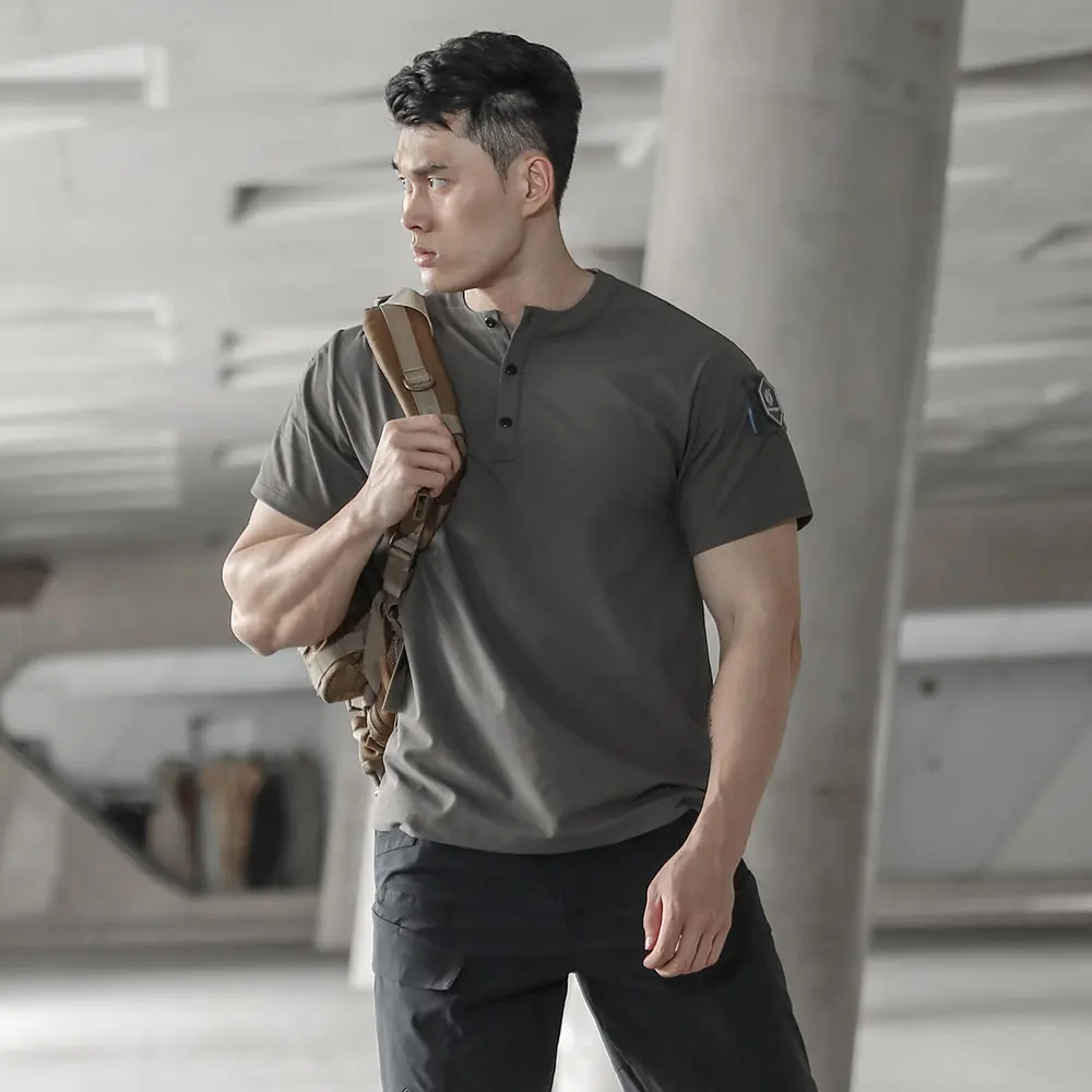 La característica más importante de una camisa Henley es su diseño sin cuello con una mosca, al igual que un polo sin solapa, lo que agrega una mosca adicional en comparación con una camiseta normal de cuello redondo. El diseño sin cuello del cuello Henley lo hace más fresco y cómodo que un polo, y los botones en el pecho son más fáciles de poner y quitar que una camiseta normal, proporcionando más espacio de ventilación cuando sea necesario.
