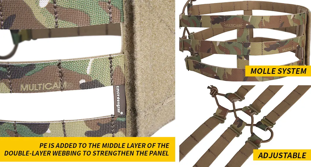 1.Sistema de expansión MOLLE: este producto se puede utilizar como plataforma de expansión conectando otros accesorios tácticos a través del sistema fijo MOLLE.