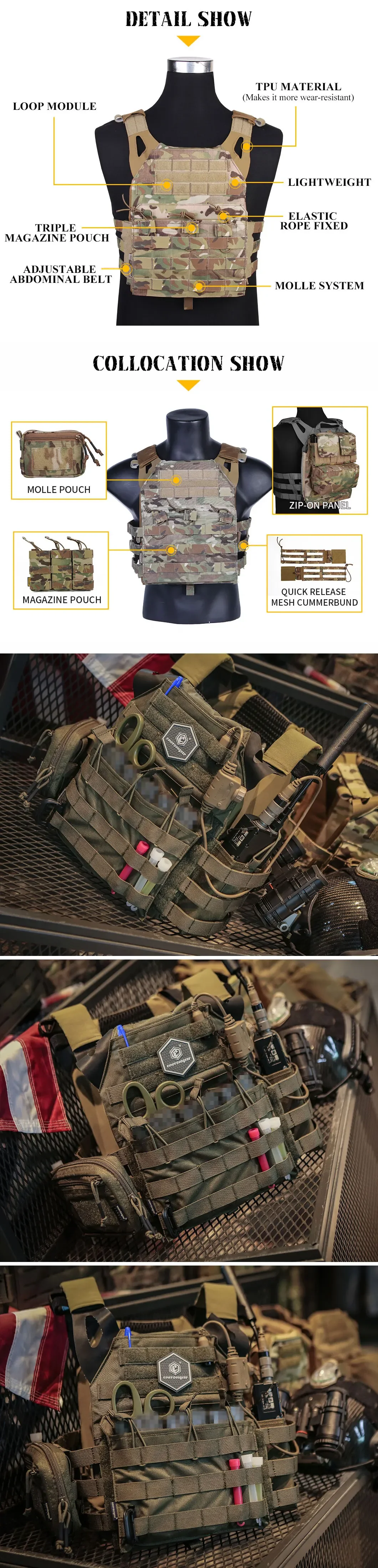 El producto se coloca como un chaleco táctico muy maniobrable.La versión simplificada del chaleco táctico Emersongear jpc se puede utilizar sin necesidad de comprar ningún accesorio adicional.Composición, bajo la premisa de enfatizar el peso ligero, el peso del chaleco táctico se reduce considerablemente.Además, también configuramos cinturones abdominales de tres filas, que se componen directamente de correas.La ventilación y ventilación generales, los usuarios de diferentes tamaños pueden atravesar la espalda.La banda elástica ajusta el espacio entre el cinturón abdominal para lograr realmente un ajuste OneSize.