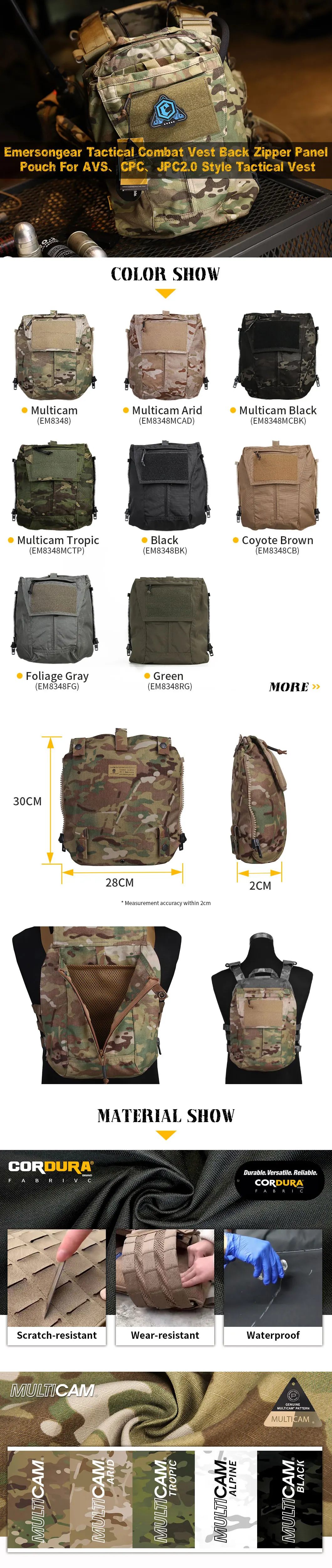 Tejido de especificación militar: el material principal del producto está hecho de NYLON Cordura 500D de especificación militar, que es duradero, resistente a la abrasión y a prueba de salpicaduras.