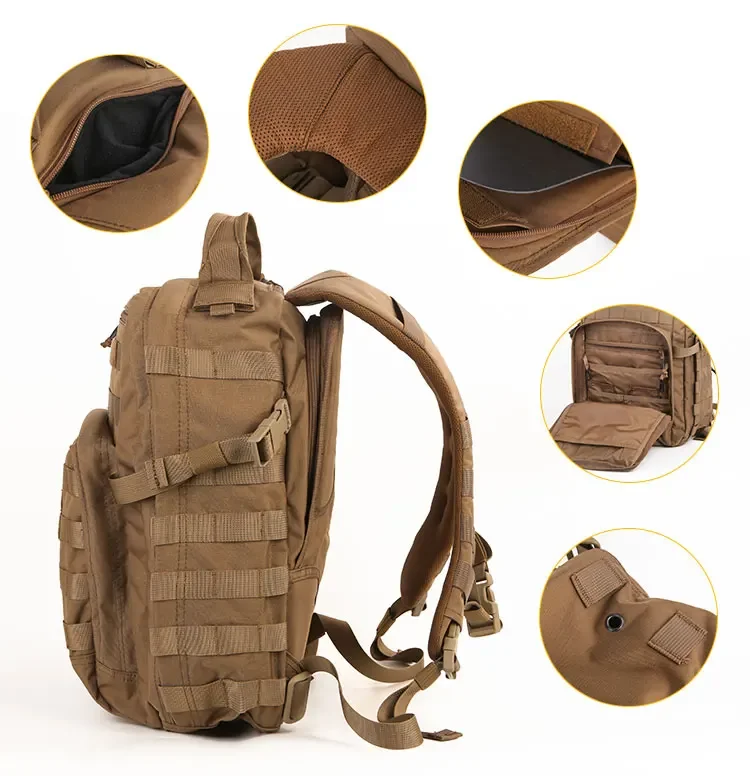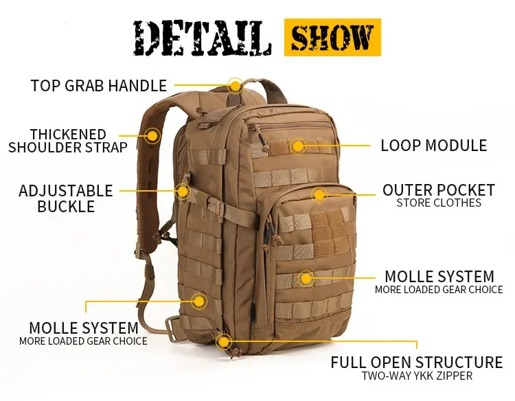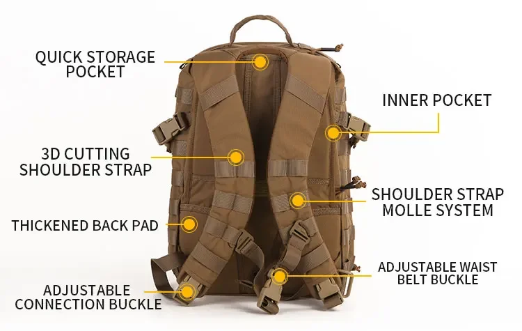 Función: repelente al agua/cojín de respaldo engrosado/estructura completamente abierta/sistema de montaje MOLLE/resistencia a la abrasión/correa de corsé