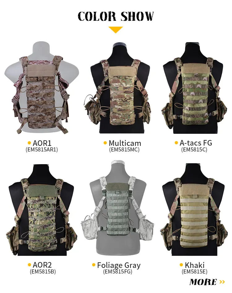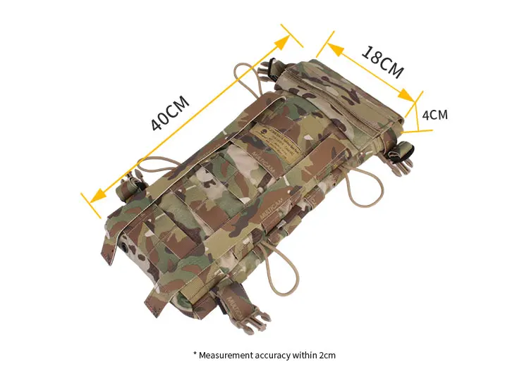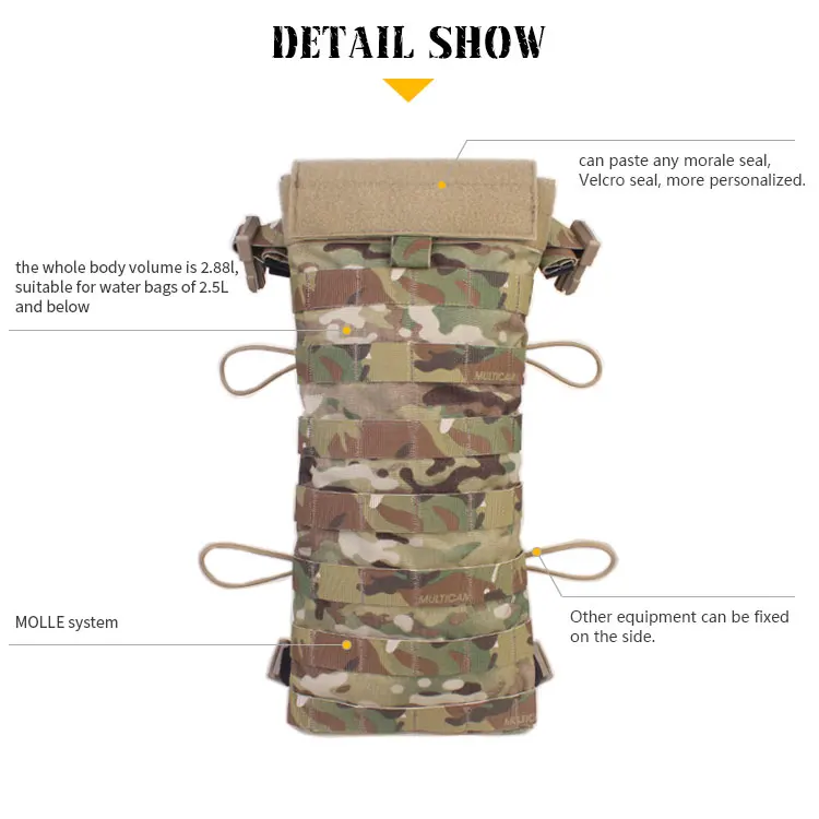The whole volume of it is 2.88L, which is suitable for water bags of 3L and below; The back Hook and Loop panel can be pasted with any morale seal or Velcro seal, which is more personalized; Side strap, so that it can fix other equipment on the side; Modular fastener; Multi color options, can match any color, camouflage equipment