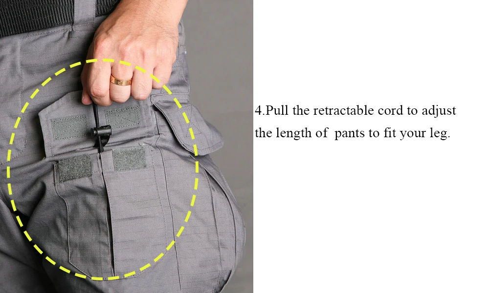 4) Tire del cordón retráctil para ajustar la longitud de los pantalones para que se ajusten a su pierna.