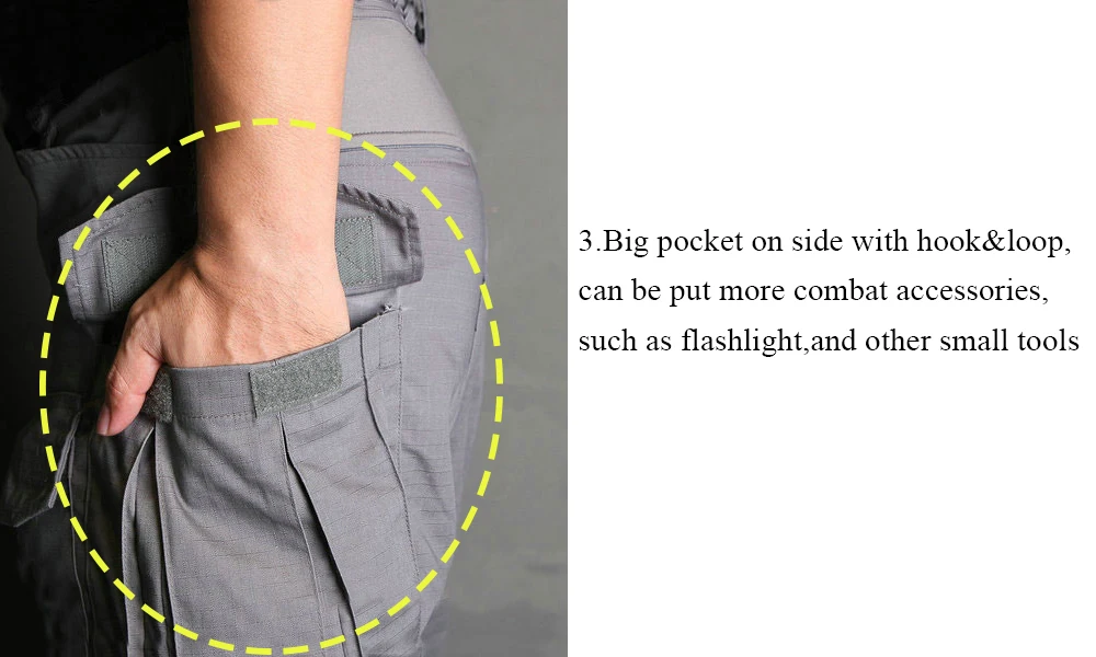 3) Bolsillo grande en el costado con gancho y bucle, se puede colocar más accesorios de combate, como linterna y otras herramientas pequeñas.