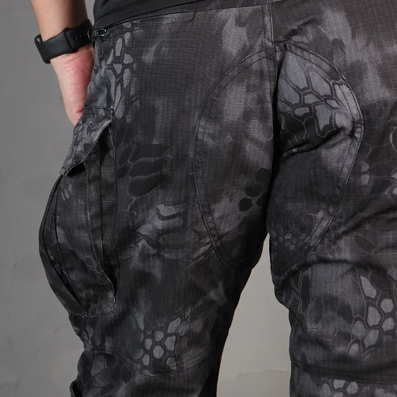 Costuras elásticas en la zona deportiva: las rodillas, la cintura trasera y la entrepierna están hechas de costuras de material elástico, lo que reduce en gran medida la fuerza de tracción en las piernas durante los deportes extremos.