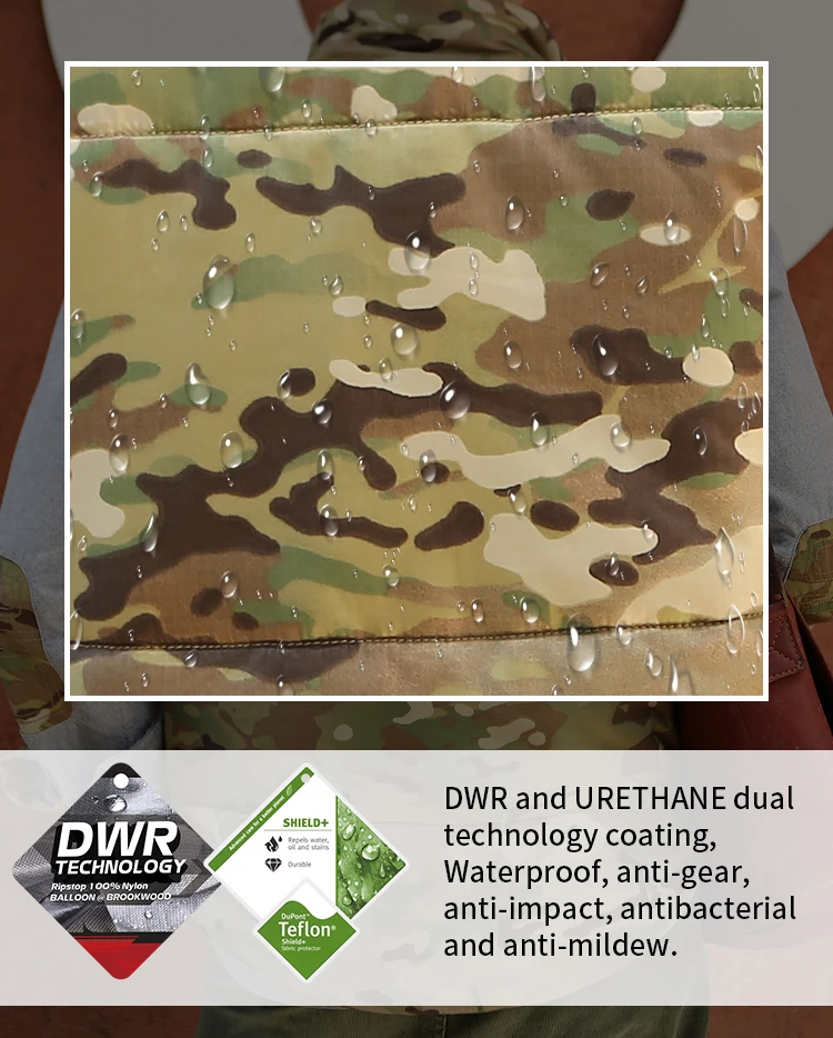 1.Tejido funcional: BROOKWOOD® BALLOON Urethane70D - El tejido Multicam también es altamente tecnológico.