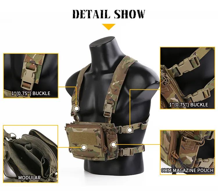 1.Modular: Todos los accesorios del chestrig se pueden ajustar o reemplazar con el mismo tipo de accesorios, lo que mejora en gran medida la compatibilidad del chestrig, para satisfacer diversas necesidades ambientales.